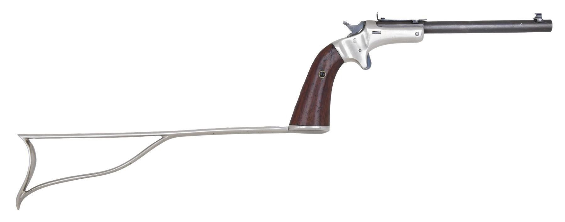 Cal. 22 LR. S# 7332. Bbl. 6". Bbl. numbered 11485. Bead front sight. V-notch rear sight. Mfg. 1886-1896. Blued bbl. Nickel frame. Smooth walnut grips. UNATTACHED ACCESSORIES: unmarked nickel-finished shoulder stock. CONDITION: grips have added varnish with crack at top of right panel, scattered dings, scratches, and handling wear. Bbl. retains 50-60% blue with scattered edge wear, fading to gray, and some light dings. Frame retains a high degree of nickel with scattered light dings and scratches. Action is stiff but functional when hand-cycled. Bore shows scattered oxidation but strong rifling. PROVENANCE: from the lifelong collection of Jim Williams. (01-25607/MJC). ANTIQUE. $400-600.