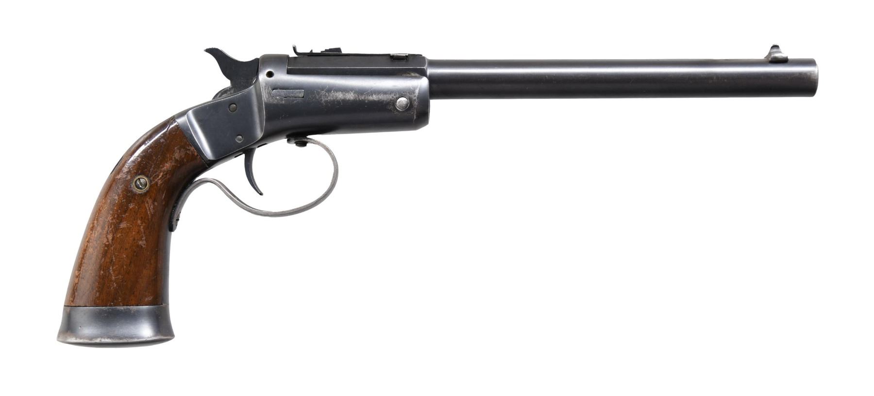 Cal. 22 RF. S# 2344A (beneath left grip panel). Bbl. 8". Model 35 single-shot break-action pistol mfg. by Stevens. Left quarter flat of the octagonal breech is marked with Steven's mfg. information. Metal components exhibit a blue finish overall. Frame is mounted with 2-piece smooth wood grips. Blade front sight, with U-notch rear sight. Matching numbers are present on the frame and bbl., and are also handwritten on the interior of the grips. Metal components retain the majority of their blue finish, exhibiting some areas of wear and thinning, as well as scattered superficial handling marks and light surface oxidation overall. Very bright bore, exhibiting some light pitting while retaining strong rifling throughout. Grips show some wear, as well as scattered marks from handling and storage, but otherwise remain sturdy and serviceable. (24-5678/MLW). CURIO. $300-450.