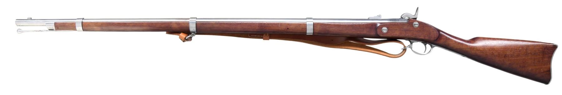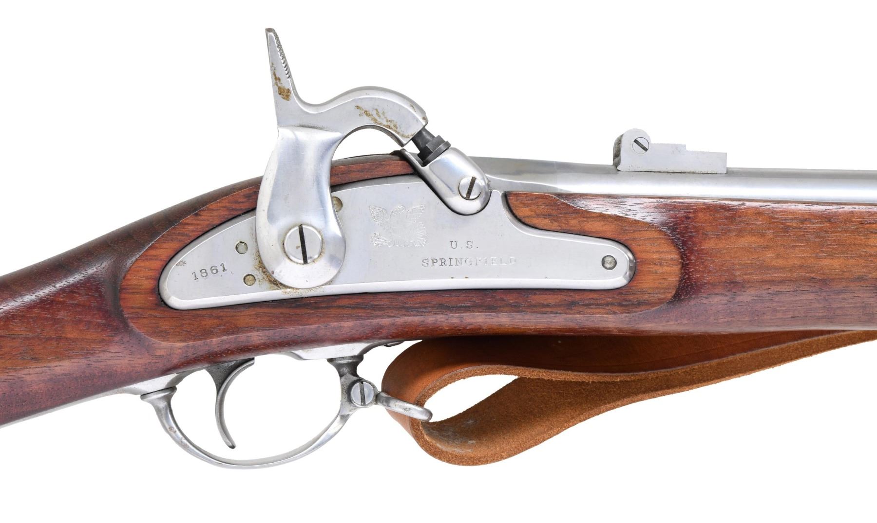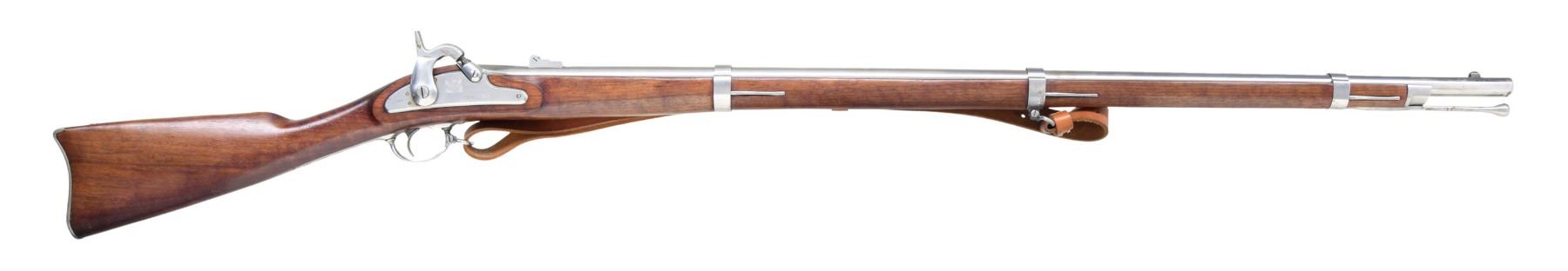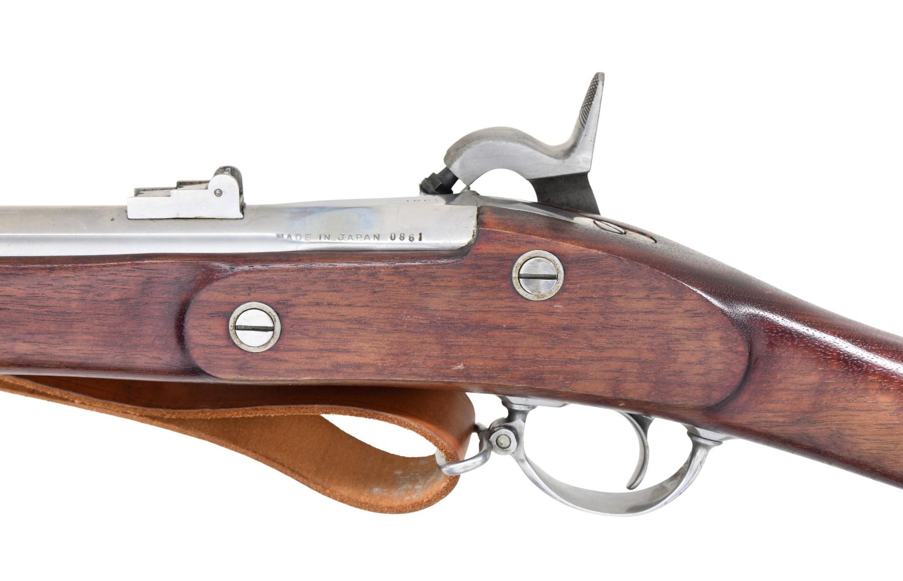 MUSKET. Cal. 58. S# 0861. Bbl. 40". Blade front sight. Flip up rear sight. Japanese-made 1861 Springfield musket likely made by Miroku. Lock has "1861" date, US Eagle, and "U.S. SPRINGFIELD" markings. Bbl. flat is marked "1861". Rear left of bbl. has "MADE IN JAPAN" and serial number. Brightly finished metal. Walnut stock with bottom-mounted sling swivels and leather repro sling. Ramrod present. CONDITION: stock shows some scattered handling marks. Metal remains mostly bright with some scattered oxidation, most notable ahead of the middle band. Action functions properly when hand-cycled. Very good bore. (01-25717/MJC). ANTIQUE. $300-500.