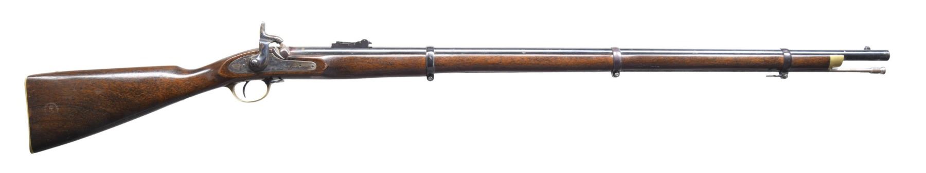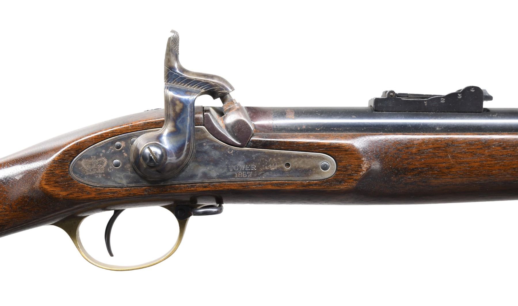Cal. 58. NSN. Bbl. 39". Blade front sight. Ladder rear sight graduated to 1000yds. Reproduction 1853 Enfield musket that appears to be "Defarbed" with no modern markings. Blued bbl. and bands. Case-colored lock and hammer with "TOWER 1862" and crown markings. Brass trigger guard and buttplate. Hardwood stock with bottom-mounted sling swivels and Birmingham trade cartouche on right side of butt. Iron ramrod is present. UNATTACHED ACCESSORIES: repro "CS" cartridge box and pouch with tools. CONDITION: stock has added varnish with scattered light flaking and handling marks. Brass parts are a light yellow color with scattered oxidation. Lock assembly retains nearly all its case-colored finish with some light oxidation. Blued parts retain 85-90% finish with scattered light oxidation. Action functions properly when hand-cycled. Bore is dark with scattered oxidation but appears to have strong rifling. (01-25566/MJC). ANTIQUE. $500-800.