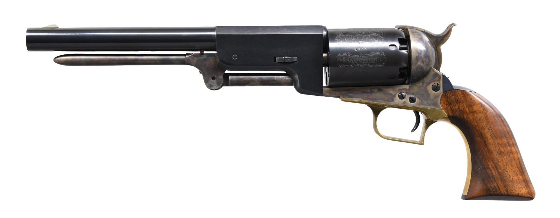 Cal. 44. S# 1723. Bbl. 9". Blade front sight. Blued bbl. and cyl. The cyl. has engraved frontier scenes. Case-colored frame, hammer, and ejector rod. Brass trigger guard and grip frame. Smooth walnut grips. CONDITION: grips show a couple light handling marks. Brass parts show a flaked spot on front strap, areas turning dull yellow, and some light tarnishing; other surfaces retain 98% original finishes. Action functions properly when hand-cycled. Very good+, bright bore. (01-25863/MJC). ANTIQUE. $800-1,200.