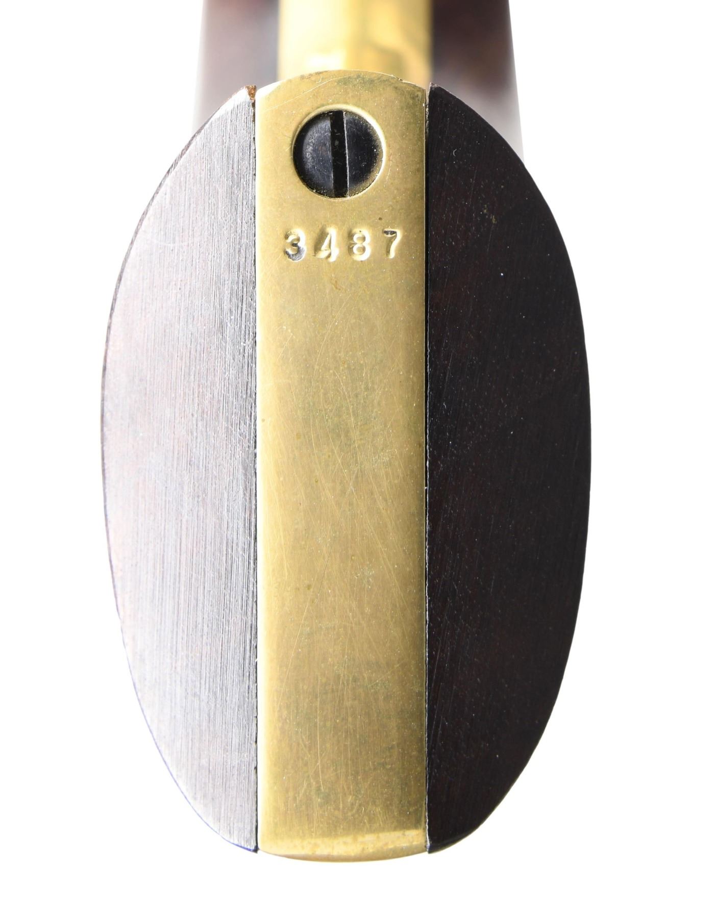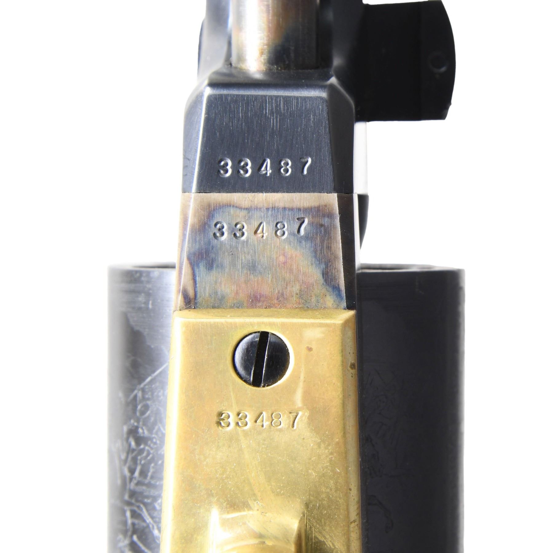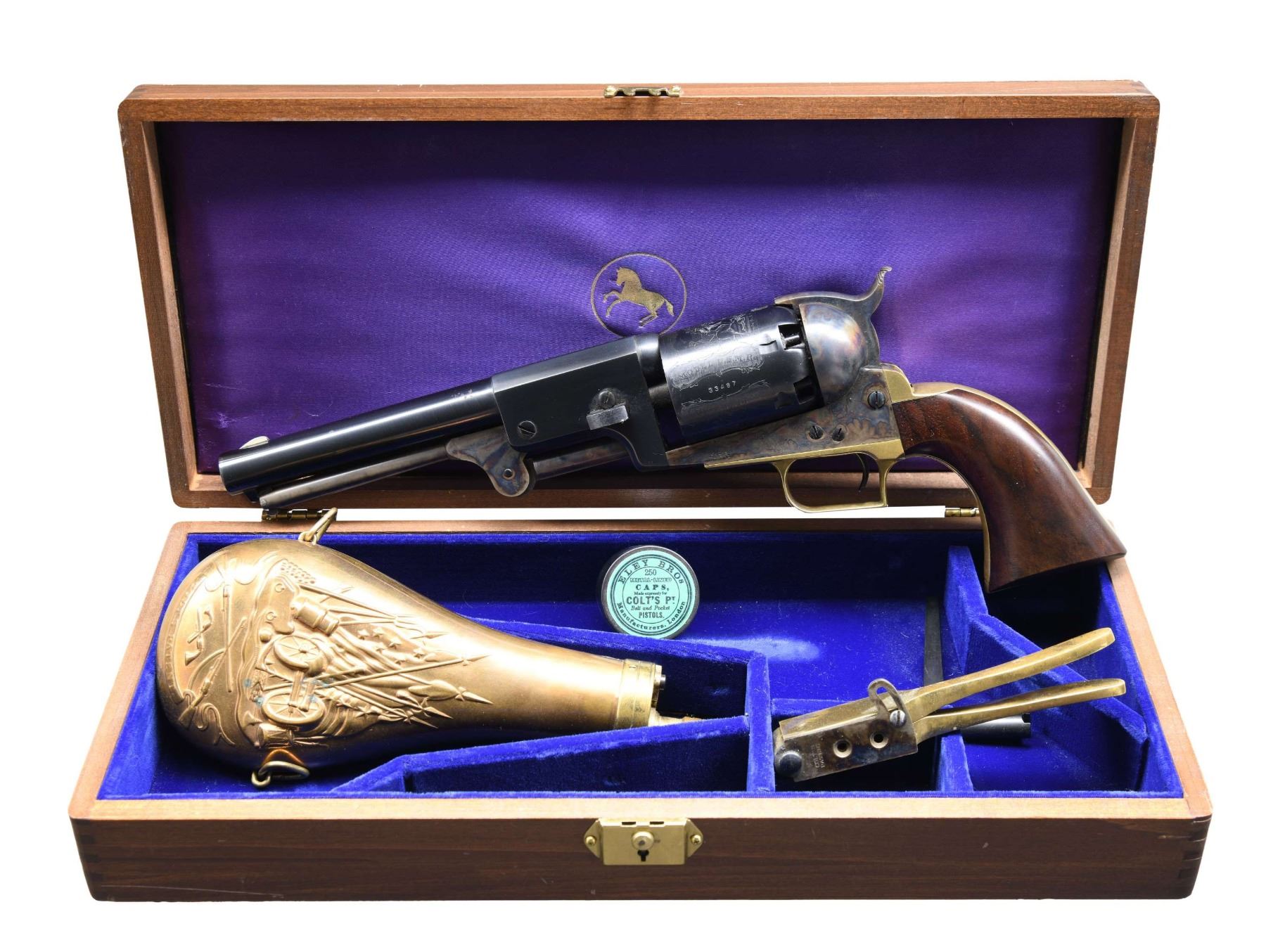 Cal. 44. S# 33487. Bbl. 7 1/2". Brass blade front sight. Blued bbl. and cyl. The cyl. has an engraved western scene. Case-colored frame, loading lever, and hammer. Brass trigger guard and grip frame. Smooth walnut grips. UNATTACHED ACCESSORIES: factory case with empty cap tin, powder flask, nipple wrench, and bullet mold. CONDITION: grips show some light handling marks. Metal retains 92% original finishes with scattered light oxidation, mostly on brass parts. Action is stiff but functional when hand-cycled. Very good+ bore. PROVENANCE: from the lifelong collection of Jim Williams. (01-25485/MJC). ANTIQUE. $500-800.