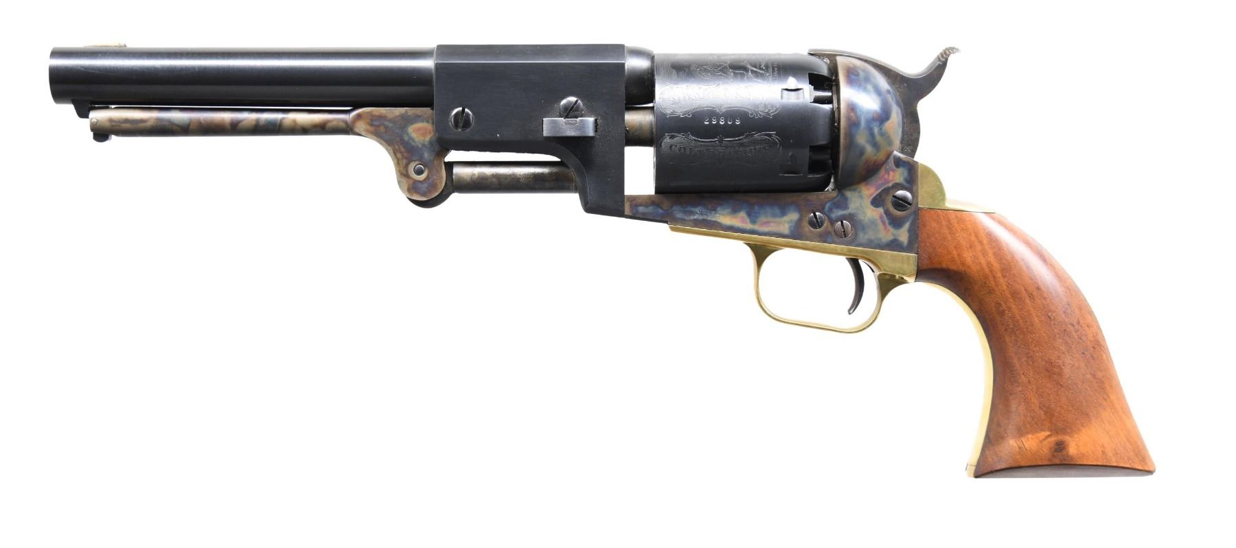 Cal. 44. S# 29809. Bbl. 7 1/2". Blade front sight. Blued bbl. and cyl. The cyl. has engraved frontier scenes. Case-colored loading lever, frame, and hammer. Brass trigger guard and grip frame. Smooth walnut grips. CONDITION: grips show light handling wear. Brass parts show some minor handling marks; other metal parts retain 98% of their original finishes with some light handling and operational wear. Action functions properly when hand-cycled. Very good, bright bore. (01-25879/MJC). ANTIQUE. $500-700.