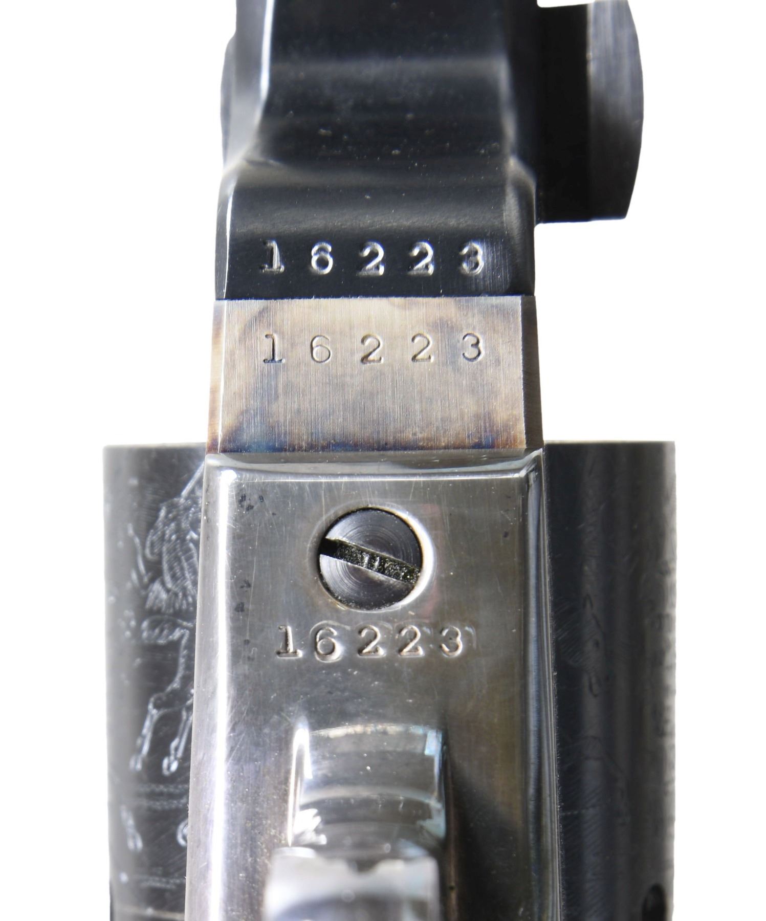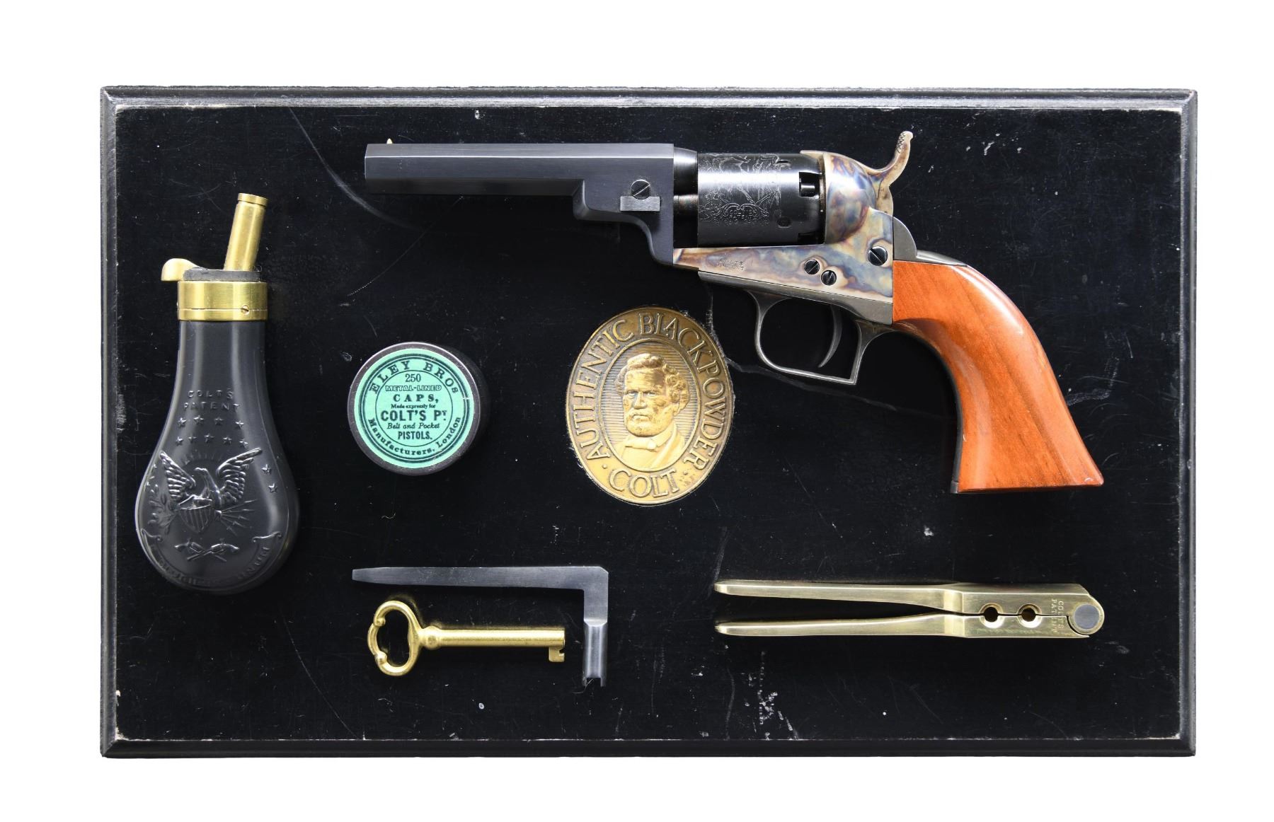 Cal. 31. S# 16223. Bbl. 4". Brass post front sight. Blued bbl. and cyl. The cyl. has an engraved western scene. Case-colored frame and hammer. Silver-plated grip frame and trigger guard. Smooth hardwood grips. UNATTACHED ACCESSORIES: factory case with nipple wrench, empty cap tin, key, bullet mold, and powder flask. CONDITION: all aspects are near excellent. PROVENANCE: from the lifelong collection of Jim Williams. (01-25488/MJC). ANTIQUE. $400-600.