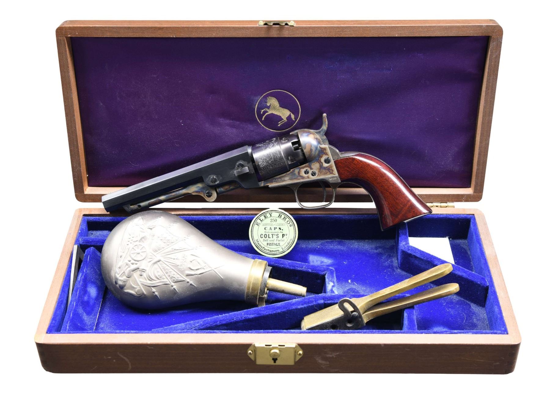 Cal. 31. S# 50176. Bbl. 6". Brass post front sight. Case-colored hammer, frame, and loading lever. Blued bbl. & cyl. Cyl. has an engraved Western scene. Silver-plated trigger guard and grip assembly. Smooth walnut grips. UNATTACHED ACCESSORIES: factory display case with powder flask, nipple wrench, bullet mold, and empty cap tin. CONDITION: all aspects are near excellent. PROVENANCE: from the lifelong collection of Jim Williams. (01-25483/MJC). ANTIQUE. $450-650.