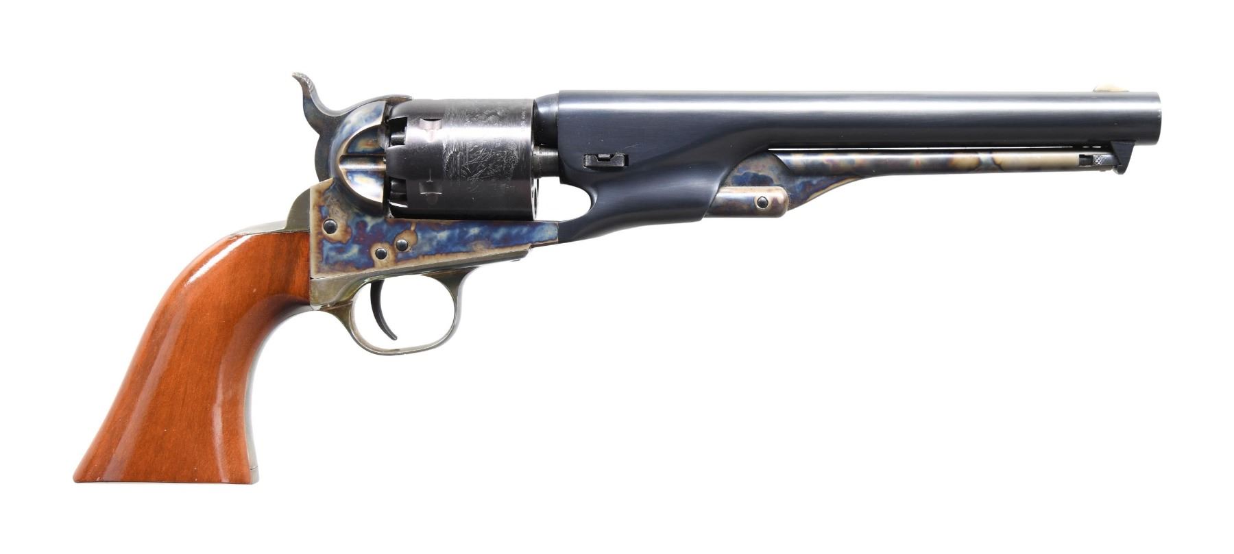 Cal. 36. S# 42255. Bbl. 7 1/2". Blade front sight. Blued bbl. and cyl. Cyl. has an engraved naval scene. Case-colored frame, loading lever, and hammer. Silver-plated trigger guard and grip frame. Smooth walnut grips. UNATTACHED ACCESSORIES: factory case with empty cap tin, bullet mold is 44 cal, and powder flask. CONDITION: grips show some light handling marks. Silver-plated parts show some sparse light tarnish. Other metal parts retain 95% original finishes with some light scratches, light handling marks, and small oxidation specks. Action appears functional when hand-cycled. Very good bore. PROVENANCE: from the lifelong collection of Jim Williams. (01-25482/MJC). ANTIQUE. $450-650.