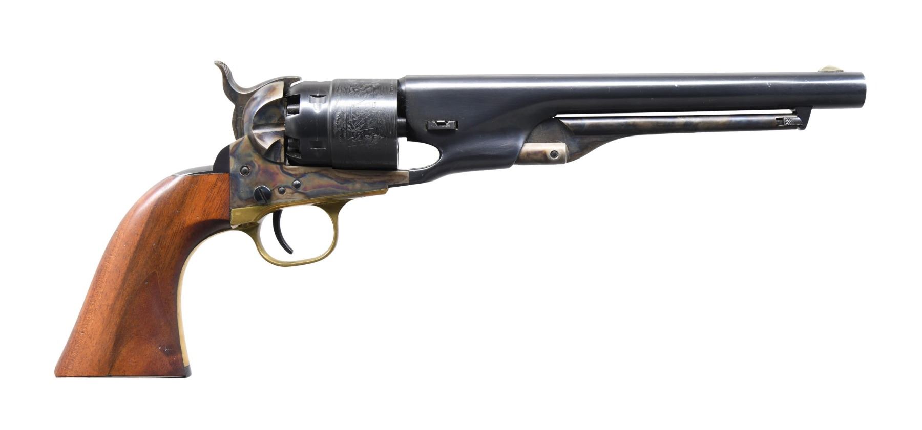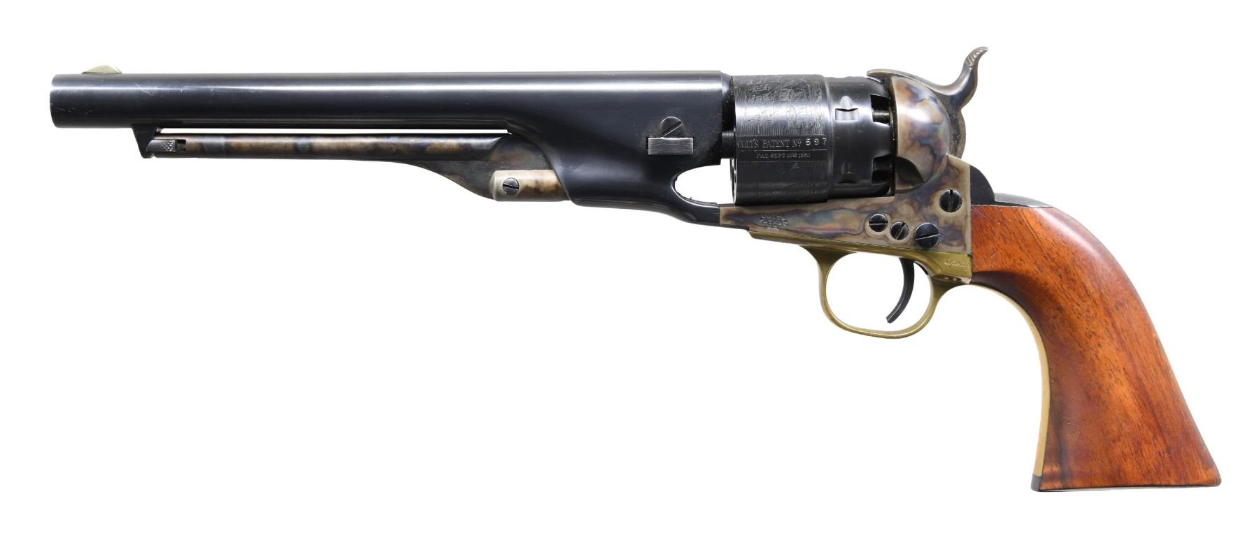 Cal. 44. S# 206597. Bbl. 8". Blade front sight. Blued bbl., back strap, and cyl. The cyl. has engraved naval scenes. Case-colored ejector rod, frame, and hammer. Brass trigger guard and front strap. Smooth walnut grips. CONDITION: grips show a few light handling marks. Brass parts show some light oxidation and handling marks; other parts retain 98% of their original finishes with some light handling marks. Action functions properly when hand-cycled. Bright, near excellent bore. (01-25877/MJC). ANTIQUE. $400-600.