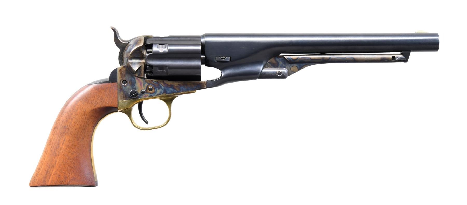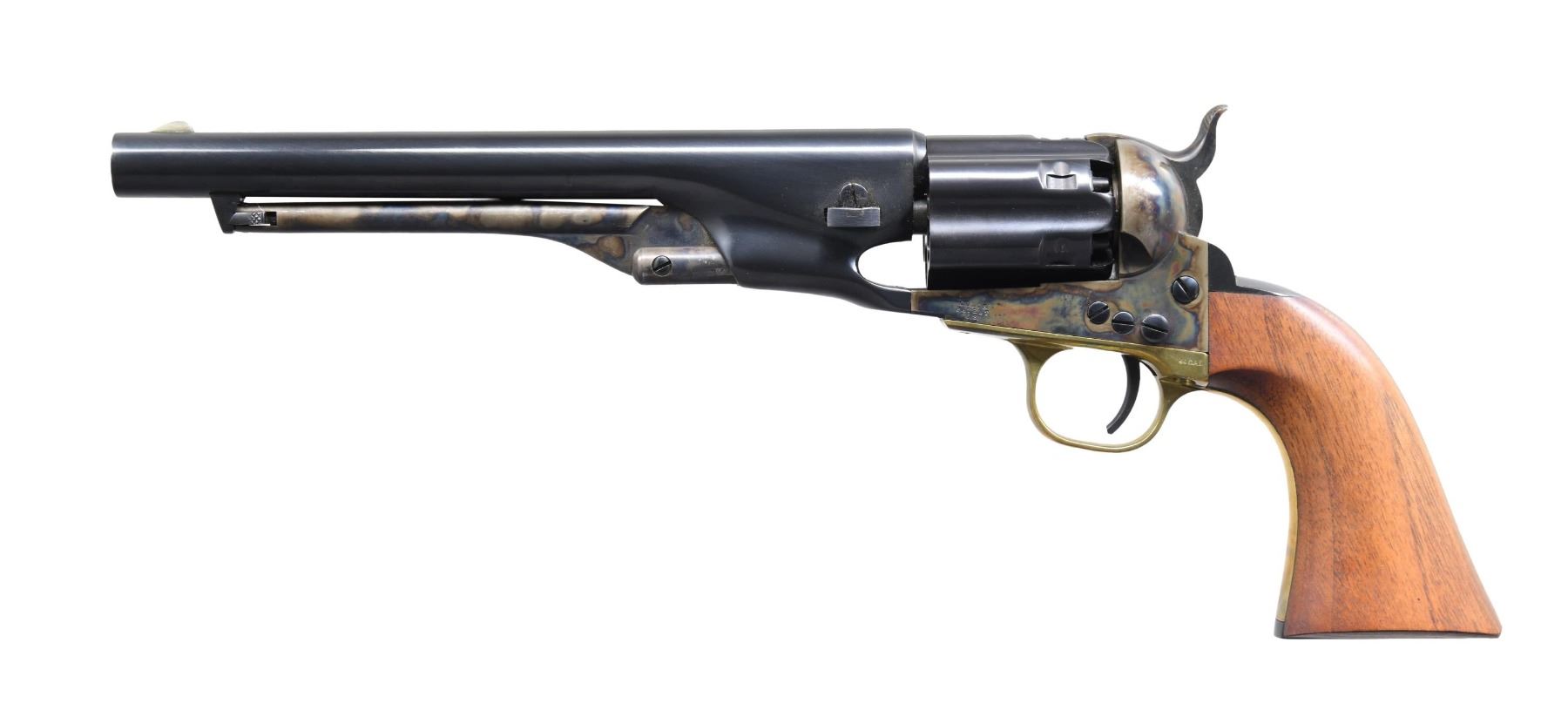 Cal. 44. S# 210915. Bbl. 8". Blade front sight. Blued bbl., back strap, and fluted cyl. Case-colored hammer, ejector rod, and frame. Brass front strap and trigger guard. Smooth walnut grips. CONDITION: grips show a few light handling marks. Brass parts show some light handing wear. Balance of metal retains 98-99% of its original finish, with a couple light handling marks. Action functions properly when hand-cycled. Very good bore. (01-25876/MJC). ANTIQUE. $600-900.