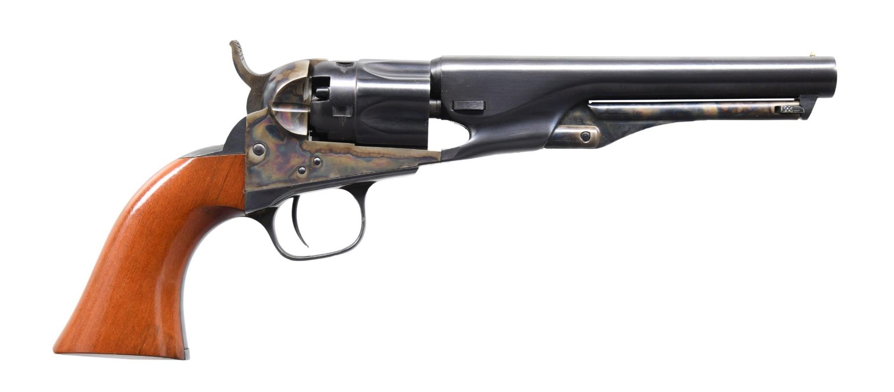 Cal. 36. S# 55077. Bbl. 5 1/2". Brass post front sight. Blued cyl. and bbl. Case-colored frame and hammer. Plated brass grip frame and trigger guard. Smooth walnut grips. CONDITION: all aspects are near excellent. (01-25875/MJC). ANTIQUE. $400-600.
