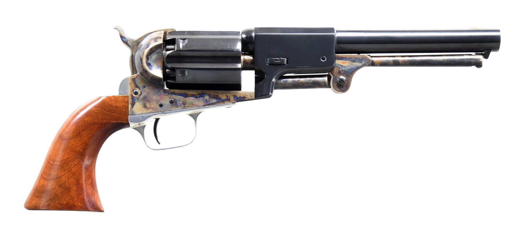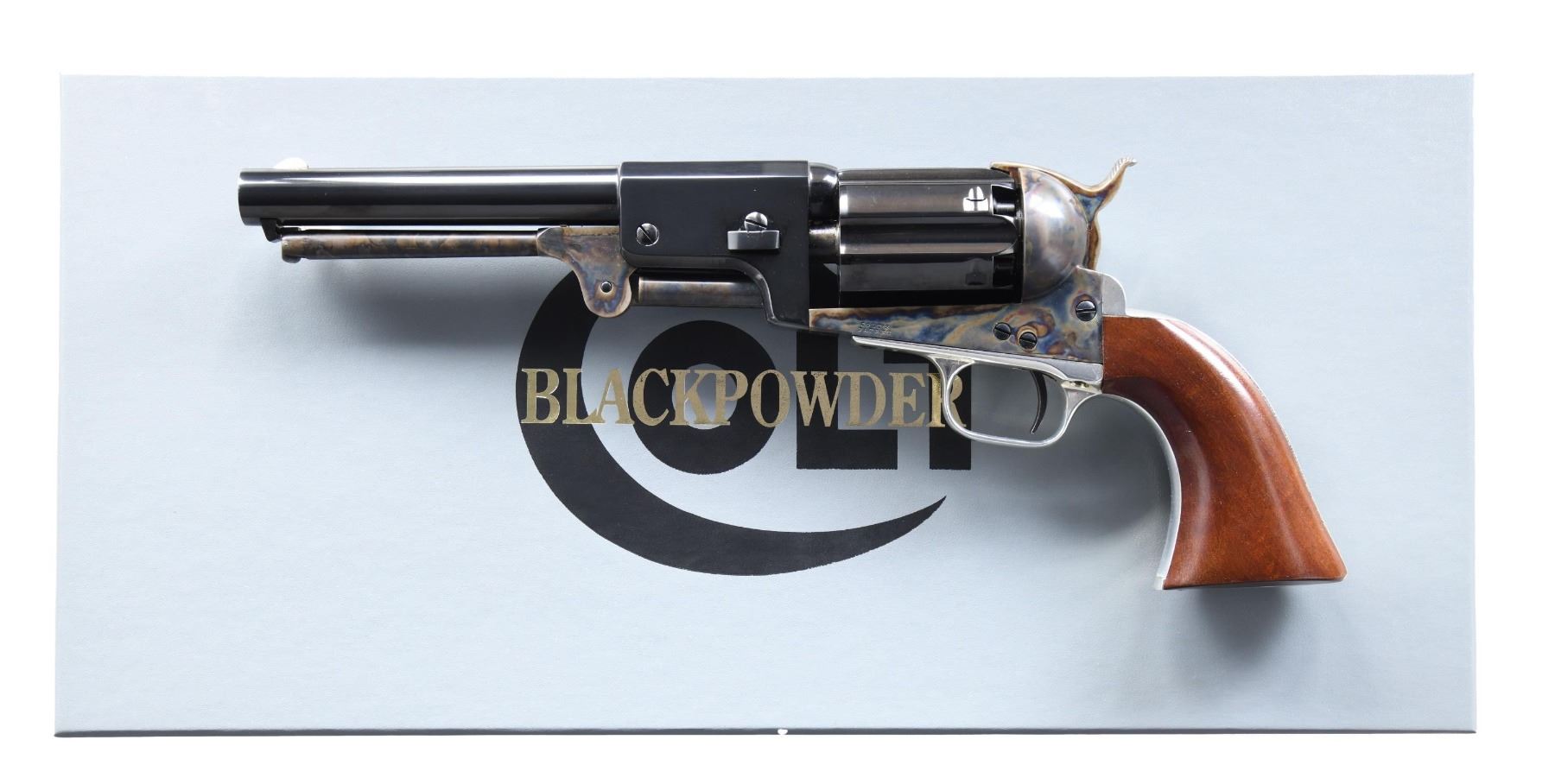 Cal. 44. S# 36406. Bbl. 7 1/2". Brass blade front sight. Blued bbl. and fluted cyl. Case-colored ejector rod, frame, and hammer. Silver-plated trigger and grip frame. Backstrap has a facsimile Sam Colt signature. Smooth walnut grips. UNATTACHED ACCESSORIES: matching-numbered shipping sleeve, factory box, and manual. CONDITION: grips show light handling wear. Silver-plated parts show some minor flaking and light oxidation. Balance of metal retains 98% of its original finish, with light handling and operational wear. Action functions properly when hand-cycled. Very good+, bright bore. (01-25868/MJC). ANTIQUE. $800-1,200.