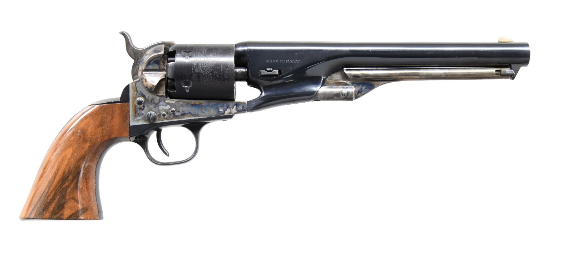 PERCUSSION REVOLVER WITH DISPLAY CASE & ACCESSORIES. Model 1860 Army single action percussion revolver mfg. in Italy and imported/retailed by Replica Arms of Marietta, OH. Top of bbl. is marked "1863 VICKSBURG 1963", with Replica Arms' importer information marked on the left and "MADE IN ITALY" marked on the right. Cyl. is engraved with Colt's 1860 Army pattern naval engagement scene. Frame, hammer, and loading lever exhibit a case color hardened finish, with remaining components exhibiting a blue finish overall. Frame is mounted with a 1-piece smooth wood grip. Brass blade front sight with hammer notched rear sight. UNATTACHED ACCESSORIES: wood display case containing a detachable stock, powder flask, bullet mold, percussion caps, and projectiles. CONDITION: excellent, with metal components retaining bountiful amounts of their original factory finishes overall. Mirror bore, exhibiting well-defined rifling throughout. Grip exhibits a few minor marks from handling and storage but otherwise remains sturdy and serviceable. Case and accessories are very good overall. (01-25569/MLW). ANTIQUE. $500-800.