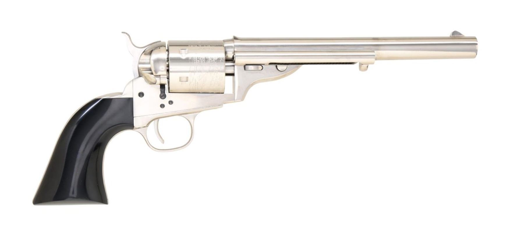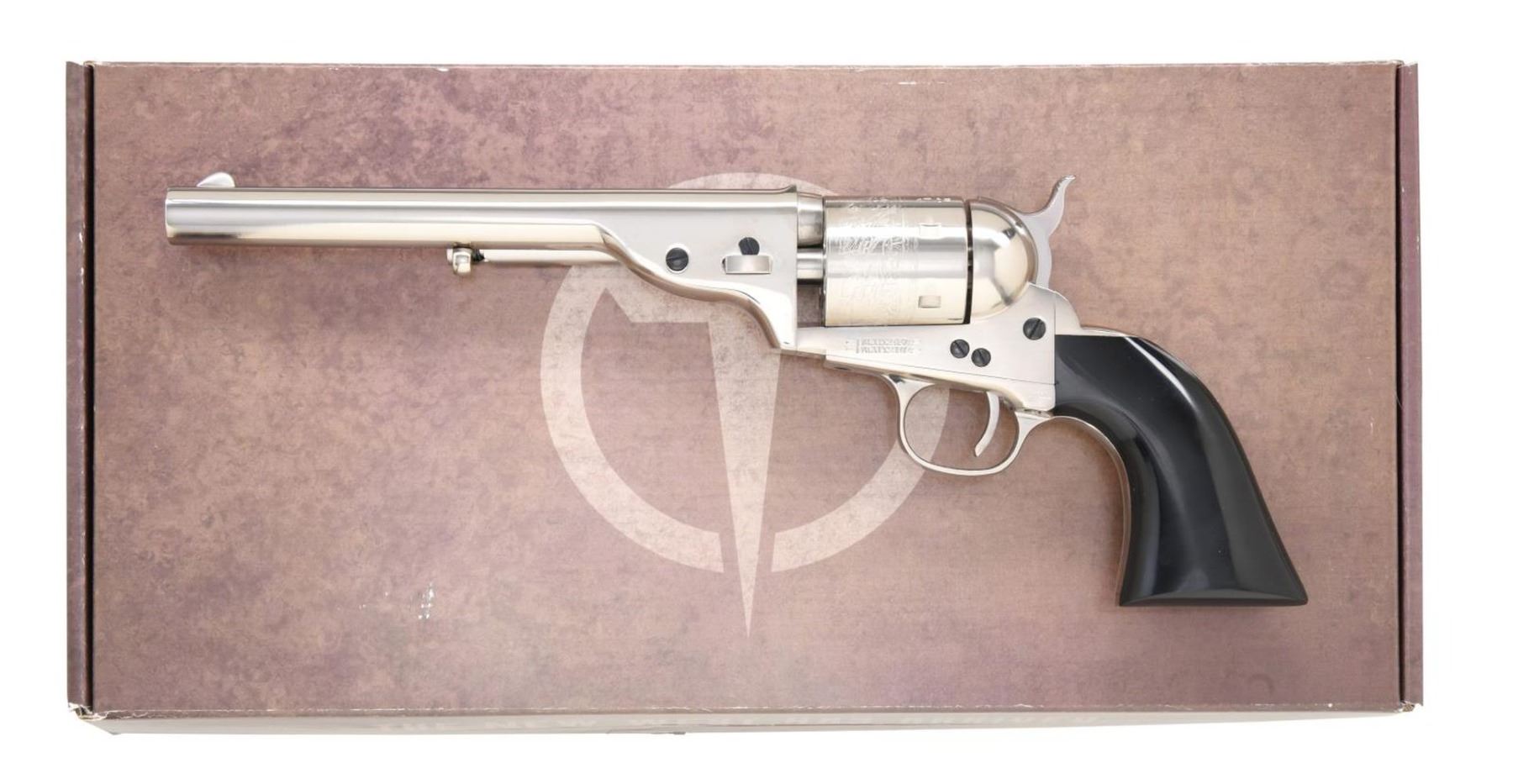 Cal. 38 Spl. S# X58059. Bbl. 7 1/2".Blade front sight. Fixed rear sight. Open-top conversion, navy-style revolver, made by Uberti and imported by Taylor's. Nickel finish with navy scene on the cyl. and fire-blued screws. Smooth, black grips. UNATTACHED ACCESSORIES: matching numbered factory box with softcase, manual, and cable lock. CONDITION: all aspects are near new; in the box. PROVENANCE: from the collection of Gun Sport Ltd., owned by Jon R. Thomas. (23-4372/MJC). MODERN. $300-500.