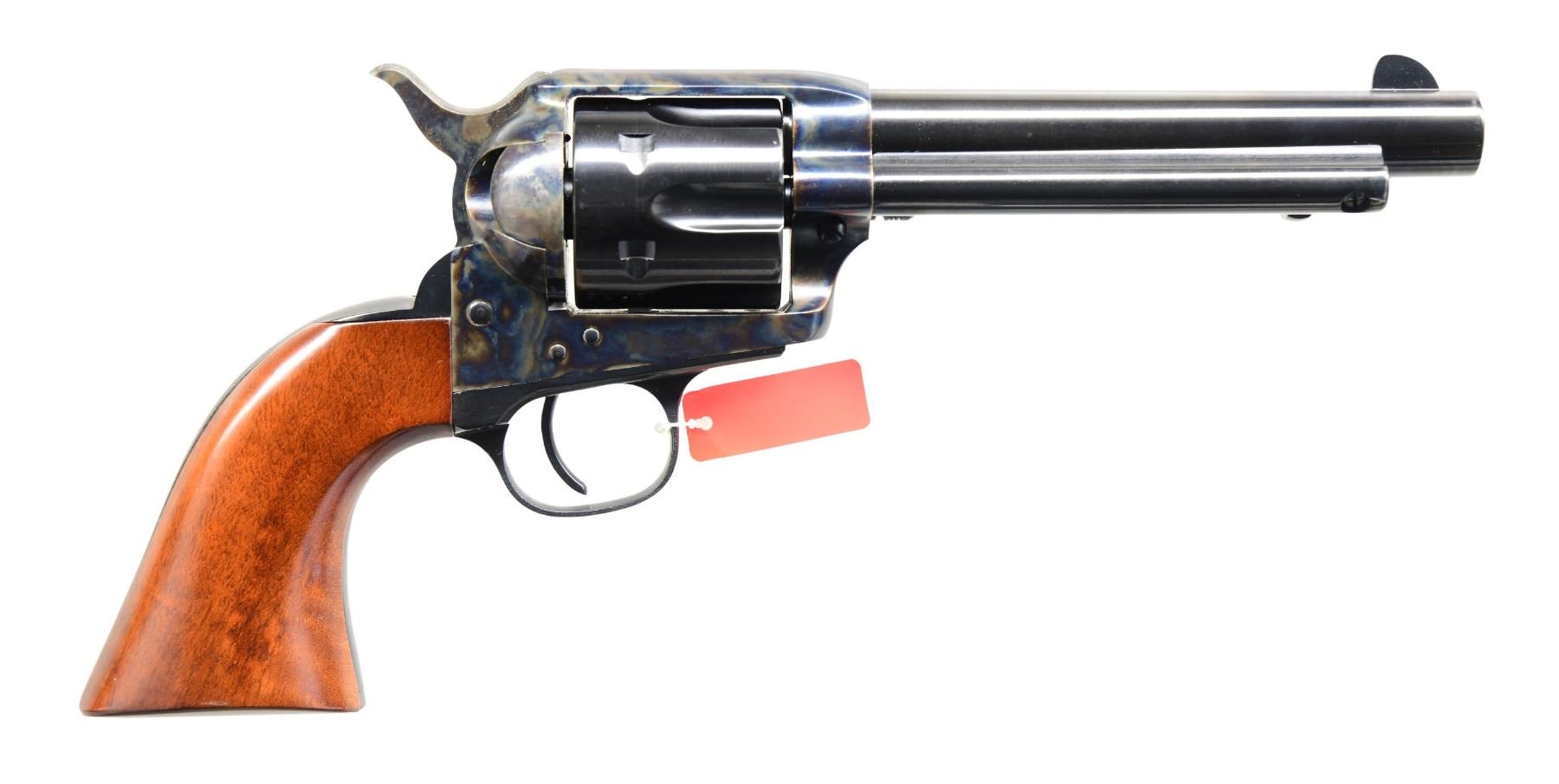 ACTION REVOLVER WITH MATCHING BOX. Cal. 357 Mag. S# UX0175. Bbl. 5 1/2". Model 1873 Cattleman, mfg. in Italy by Uberti and imported/retailed by Taylor's & Co. Top of bbl. is marked with Taylor's importer and Uberti's mfg. information, with the model and cal. designations marked on the left. Left side of the frame is marked with "patent" information. Frame and hammer exhibit a case color hardened finish, with the cyl., cyl. base pin, frame screws, bbl., ejector rod housing, trigger guard, and rear grip strap exhibiting a blue finish. Frame is mounted with a 1-piece smooth wood grip. Standard SAA pattern blade front sight and frame notched rear sight. UNATTACHED ACCESSORIES: matching Taylor's & Co. box. CONDITION: near new, with metal components retaining virtually all of their original factory finishes overall. Cyl. exhibits a light dragline. Mirror bore, exhibiting grease while retaining well-defined rifling throughout. Grip is excellent. Box shows some light exterior wear from handling and storage but otherwise remains sturdy and serviceable. PROVENANCE: from the collection of Gun Sport Ltd., owned by Jon R. Thomas. (23-2845/MLW). MODERN. $300-500.