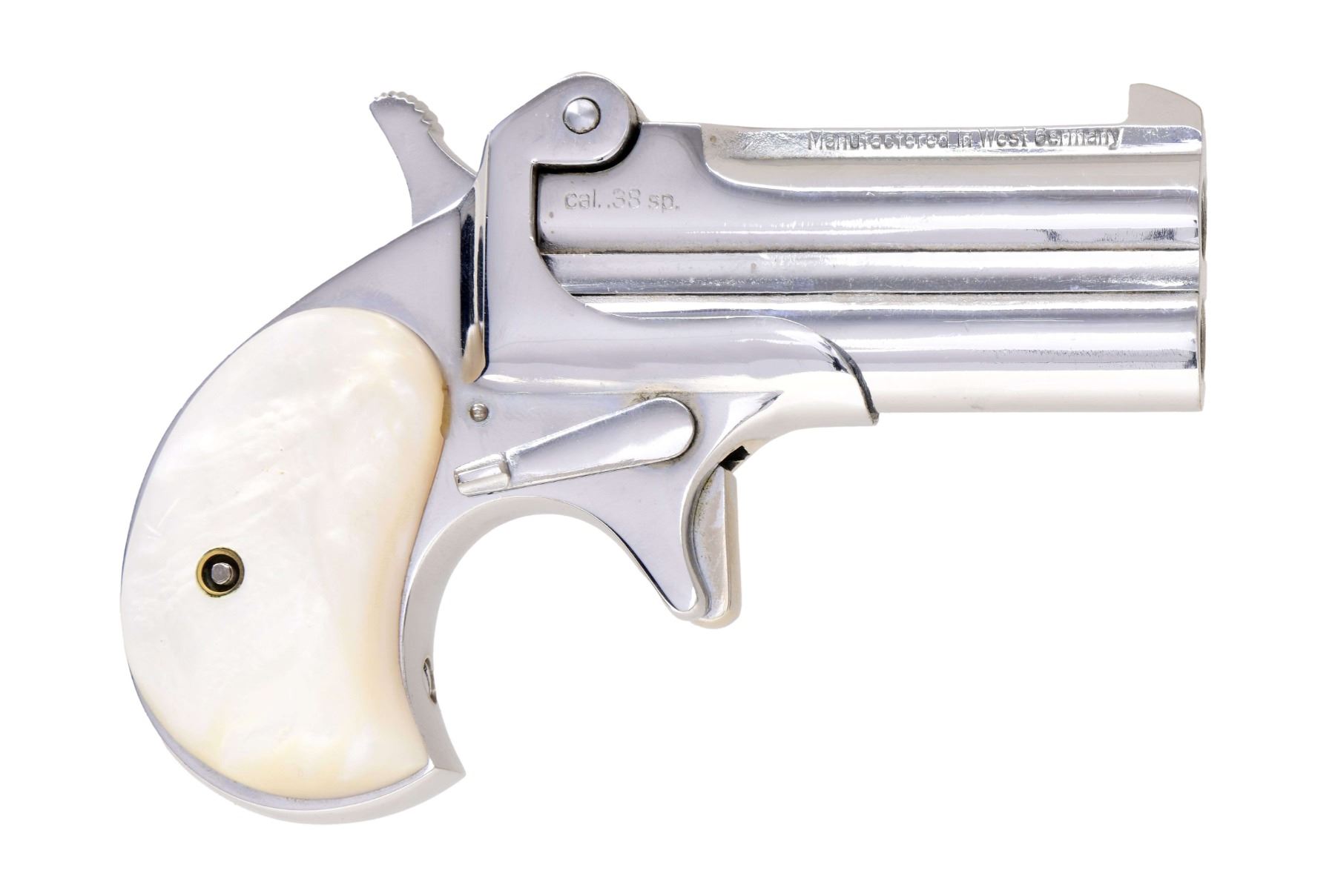 Cal. 38 Spl. S# 6710. Bbls. 3" matching numbered with German eagle N proof. Mfg. 1950's to late 1960's in West Germany as faithful modern copy of Remington O/U derringer. Offered in rimfire and centerfire calibers with most being 22 LR. Chrome plated with simulated pearl grips. CONDITION: all aspects near excellent appearing new and unfired. (24-2159/NW). CURIO. $200-300.