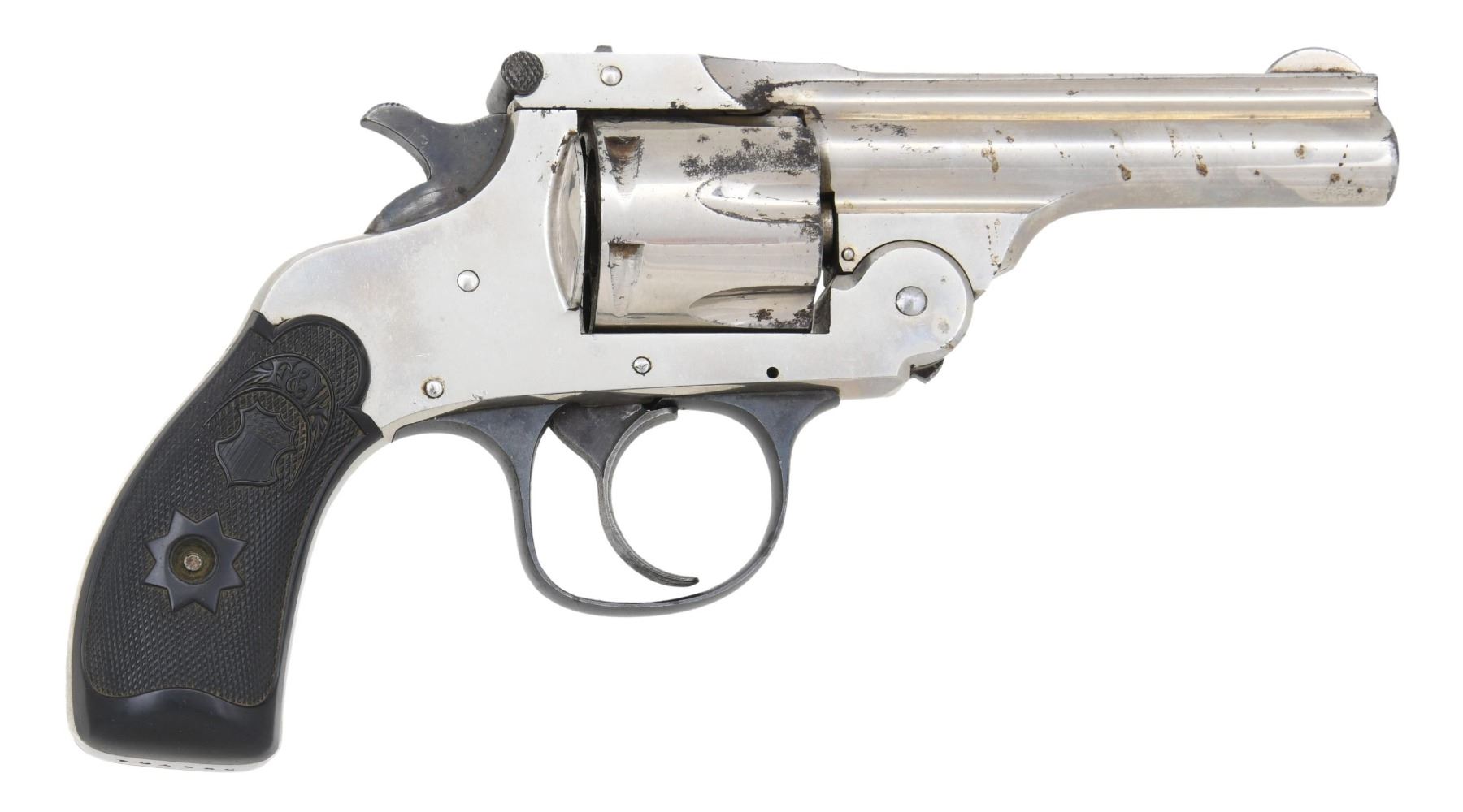 Cal. 32 S&W. S# 396704. Bbl. 3 1/2". Round blade front sight. U-notch rear sight. Nickel finish with blued trigger guard and a case-colored hammer and trigger. Checkered black hard rubber grips with F&W logo. CONDITION: grips show some dirt staining and handling wear. Trigger and hammer show overall fading to gray with some oxidation. Balance of metal retains 85% nickel, with scattered oxidation, flaking, and pitting. Trigger does not actuate the hammer in DA mode and will require attention to fix. Worn, pitted bore with scattered oxidation. (24-4421/MJC). CURIO. $150-200.