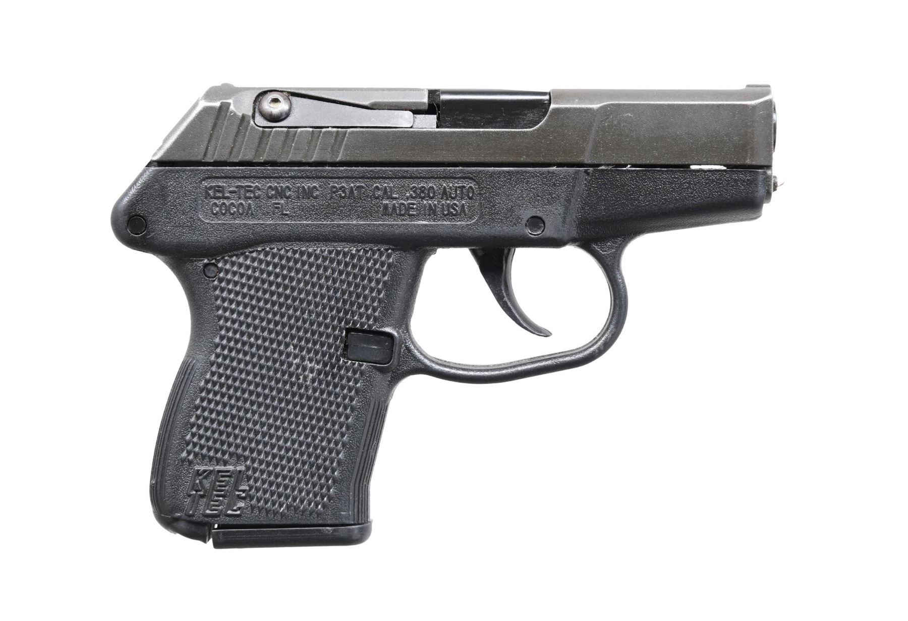1) KEL-TEC P3AT SEMI-AUTOMATIC PISTOL WITH MATCHING FACTORY CASE. Cal. 380 ACP. S# KVN01. Bbl. 2 3/4". Model P3AT semi-automatic pistol mfg. by Kel-Tec. Right side of the checkered black polymer frame is marked with Kel-Tec's mfg. information, as well as with the model and cal. designations. Rear of frame is marked with the S#. Slide exhibits a matte gray finish, with the bbl. exhibiting a blue finish. MAGS: 1 6-rd. MECGAR mag. UNATTACHED ACCESSORIES: matching factory hard case. CONDITION: slide retains fair amounts of its original factory finish, exhibiting oxidation and light to mild pitting overall. Bright bore, exhibiting some pitting, while retaining strong rifling throughout. Frame exhibits some smoothing, wear, as well as some scattered marks from handling and storage. (24-4693/MLW). 2) PHOENIX ARMS MODEL HP22A SEMI-AUTOMATIC PISTOL WITH FACTORY BOX. Cal. 22 LR. S# 4241242. Bbl. 3". Model HP22A semi-automatic pistol mfg. by Phoenix Arms. Left side of slide is marked with Phoenix Arms' mfg. information, with the model and cal. designations marked on the right. Left side of the bbl. is marked ".22 LONG RIFLE". Aluminum frame, slide, and bbl. sleeve exhibit a anodized blue finish. Bbl. is polished in-the-white. Frame is mounted with 2-piece checkered black plastic grips. Grooved V/R with blade front sight and square notch rear sight. Mag. release button and safety are both frozen and require gunsmith attention. MAGS: 1 10-rd. UNATTACHED ACCESSORIES: non-matching factory box. CONDITION: metal components retain the majority of their original factory finish, exhibiting some areas of discoloration, with an area of oxidation present on the left side of the slide. Bright bore, exhibiting strong rifling throughout. Grips are very good overall. (24-4694/MLW). 3) PHOENIX ARMS MODEL HP25A SEMI-AUTOMATIC PISTOL WITH FACTORY BOX. Cal. 25 ACP. S# 4355486. Bbl. 3". Model HP25A semi-automatic pistol mfg. by Phoenix Arms. Left side of slide is marked with Phoenix Arms' mfg. information, with the model and cal. designations marked on the right. Left side of the bbl. sleeve is marked "25 CAL. A.C.P.". Frame, slide, and bbl. sleeve exhibit a matte black finish. Frame is mounted with 2-piece checkered black plastic grips. Grooved V/R with blade front sight and square notch rear sight. MAGS: 1 10-rd. UNATTACHED ACCESSORIES: non-matching HP22A factory box. CONDITION: very good, with metal components retaining the majority of their factory matte black finish overall. Bright bore, exhibiting strong rifling throughout. Grips are very good overall. Box shows some exterior wear, but otherwise remains sturdy and serviceable. (24-4695/MLW). 4) PHOENIX ARMS MODEL HP22A SEMI-AUTOMATIC PISTOL WITH FACTORY BOX. Cal. 22 LR. S# 4241269. Bbl. 3". Model HP22A semi-automatic pistol mfg. by Phoenix Arms. Left side of the slide is marked with Phoenix Arms' mfg. information, with the model and cal. designations marked on the right. Left side of the bbl. sleeve is marked ".22 LONG RIFLE". Frame, slide, and bbl. sleeve exhibit a blue anodized finish. Bbl. is polished in-the-white. Frame is mounted with 2-piece checkered black plastic grips. Grooved V/R with blade front sight and square notch rear sight. Safety is frozen and slide cannot fully retract. MAGS: 1 10-rd. UNATTACHED ACCESSORIES: non-matching HP25A factory box. CONDITION: good, with some areas of discoloration and scattered handling marks overall. Bright bore, exhibiting strong rifling throughout. Grips are very good overall. Box shows some light to mild exterior wear, but otherwise remains sturdy and serviceable. PROVENANCE: The Estate Collection of Charles Wagner. (24-4696/MLW). ALL MODERN. $300-400.