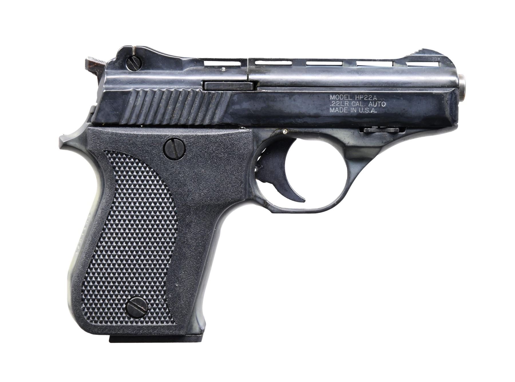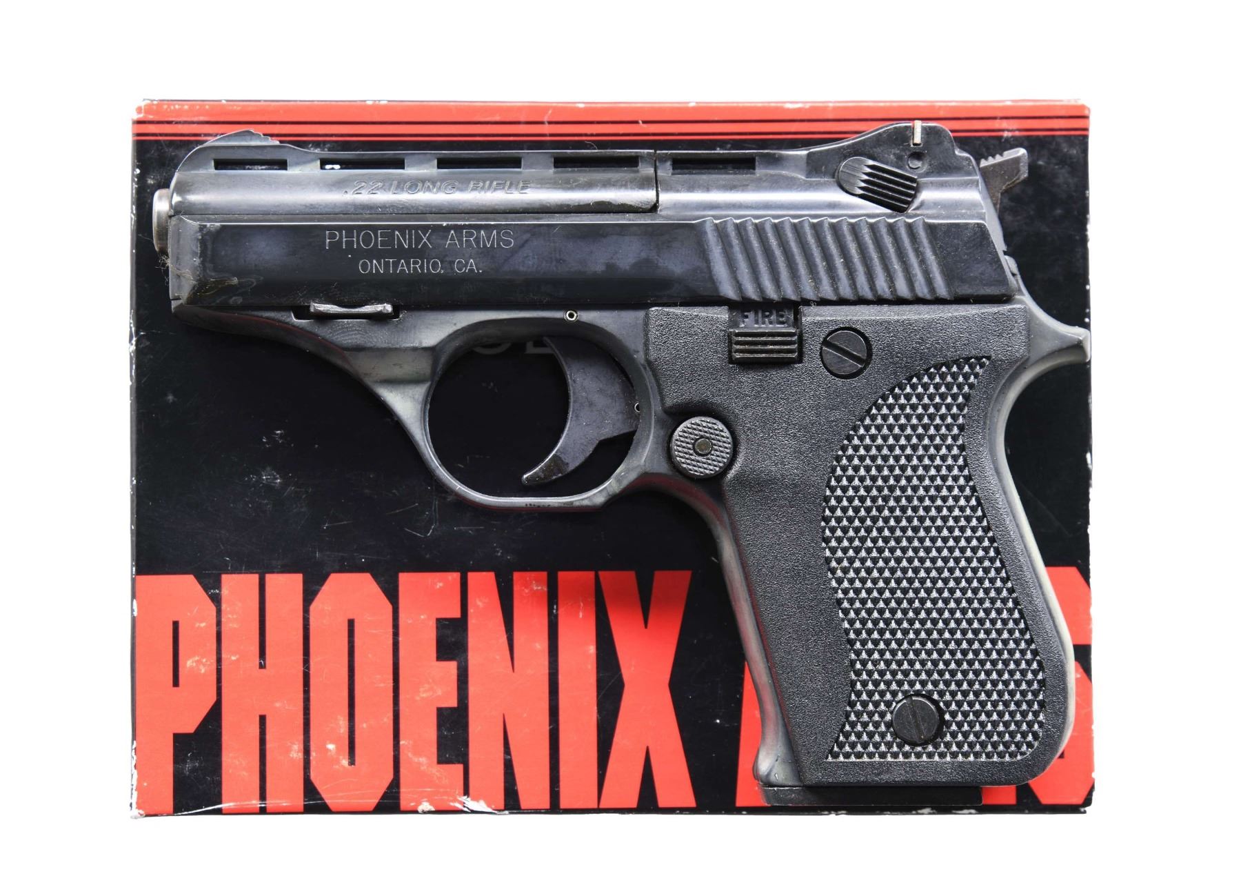 WITH FACTORY BOXES. 1) Cal. 22 LR. S# 4241271. Bbl. 3". HP22A semi-automatic pistol mfg. by Phoenix Arms. Left side of slide is marked with Phoenix Arms' mfg. information, with the model and cal. designations marked on the right. Left side of the bbl. sleeve is marked ".22 LONG RIFLE". Alloy frame, slide, and bbl. sleeve exhibits a blue anodized finish. Frame is mounted with 2-piece checkered black plastic grips. Grooved V/R with blade front sight and square notch rear sight. MAGS: 1 10-rd. UNATTACHED ACCESSORIES: factory box. CONDITION: metal components retain large amounts of their original factory finish, with areas of brown discoloration (predominately on the frame) present overall. Mirror bore, exhibiting well defined rifling throughout. Grips are excellent. Box shows some mild exterior wear, but otherwise remains sturdy and serviceable. (24-4689/MLW). 2) Cal. 22 LR. S# 4241240. Bbl. 3". HP22A semi-automatic pistol mfg. by Phoenix Arms. Left side of slide is marked with Phoenix Arms' mfg. information, with the model and cal. designations marked on the right. Left side of the bbl. sleeve is marked ".22 LONG RIFLE". Alloy frame, slide, and bbl. sleeve exhibits a blue anodized finish. Frame is mounted with 2-piece checkered black plastic grips. Grooved V/R with blade front sight and square notch rear sight. MAGS: 1 10-rd. UNATTACHED ACCESSORIES: factory box. CONDITION: metal components retain the majority of their original factory finish, exhibiting areas of brown discoloration (predominately on the frame) overall. Mirror bore, exhibiting strong rifling throughout. Grips are excellent. Box shows some mild exterior wear, but otherwise remains sturdy and serviceable. (24-4690/MLW). 3) Cal. 22 LR. S# 4241270. Bbl. 3". HP22A semi-automatic pistol mfg. by Phoenix Arms. Left side of slide is marked with Phoenix Arms' mfg. information, with the model and cal. designations marked on the right. Left side of the bbl. sleeve is marked ".22 LONG RIFLE". Alloy frame, slide, and bbl. sleeve exhibits a blue anodized finish. Frame is mounted with 2-piece checkered black plastic grips. Grooved V/R with blade front sight and square notch rear sight. MAGS: 1 10-rd. UNATTACHED ACCESSORIES: factory box. CONDITION: metal components retain the majority of their original factory finish, exhibiting some oxidation/pitting on the left side of the slide and on the safety. Mirror bore, exhibiting well defined rifling throughout. Grips are excellent. Box sows some mild exterior wear, but otherwise remains sturdy and serviceable. (24-4691/MLW). 4) Cal. 22 LR. S# 4241241. Bbl. 3". HP22A semi-automatic pistol mfg. by Phoenix Arms. Left side of slide is marked with Phoenix Arms' mfg. information, with the model and cal. designations marked on the right. Left side of the bbl. sleeve is marked ".22 LONG RIFLE". Alloy frame, slide, and bbl. sleeve exhibits a blue anodized finish. Frame is mounted with 2-piece checkered black plastic grips. Grooved V/R with blade front sight and square notch rear sight. MAGS: 1 10-rd. UNATTACHED ACCESSORIES: factory box. CONDITION: metal components retain the majority of their original factory finish, exhibiting a few areas of brown discoloration on the frame. Mirror bore, exhibiting well defined rifling throughout. Trigger assembly and/or frame safety mechanism is not functioning properly, with the slide getting caught in the rear position, and the hammer being locked in the rear position. Box shows some exterior wear, but otherwise remains sturdy and serviceable. PROVENANCE: The Estate Collection of Charles Wagner. (24-4692/MLW). ALL MODERN. $300-400.