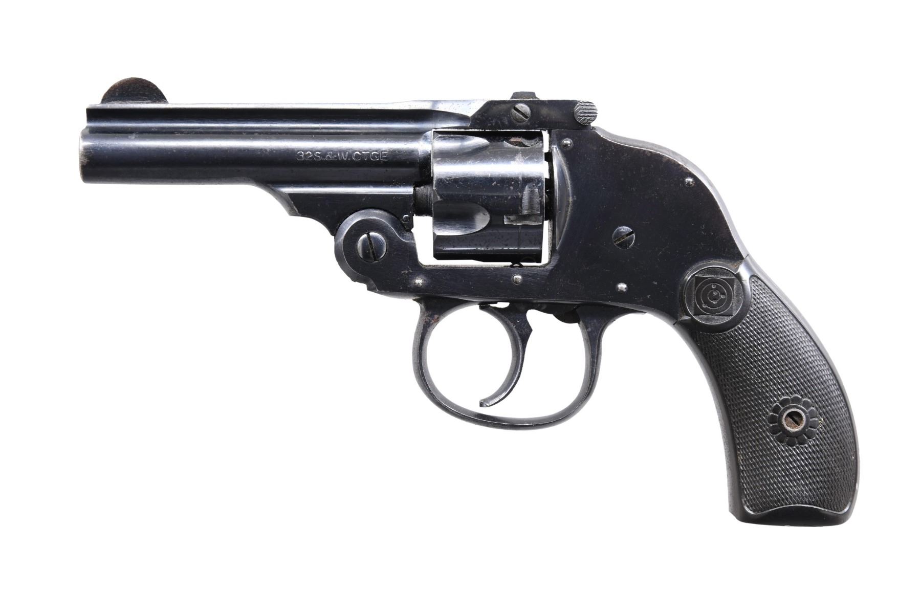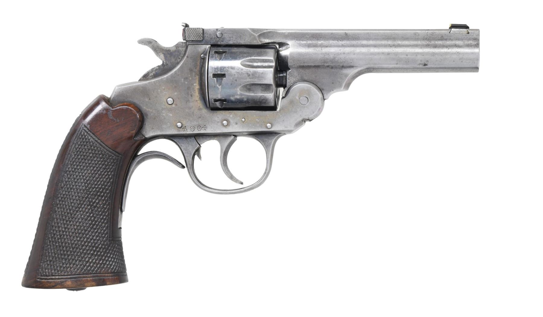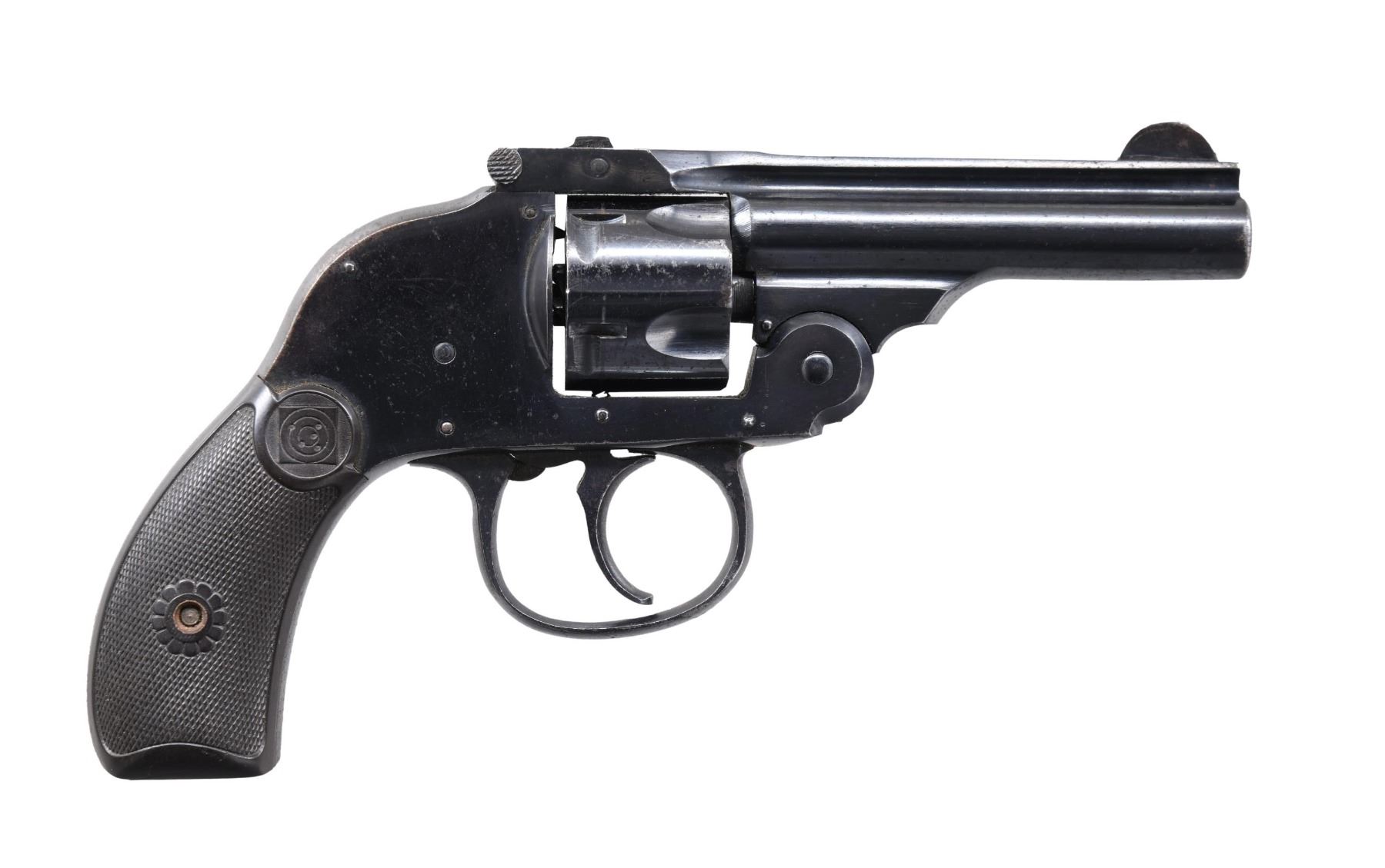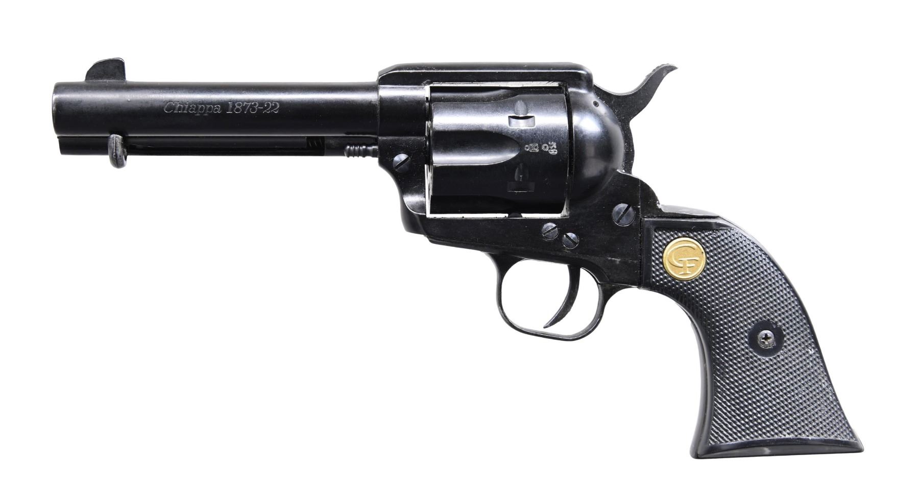This lot consists of the following revolvers: 1) CHIAPPA 1873-22 SA REVOLVER. Cal. 22 LR. S# 13M31383. Bbl. 4 3/4". Blade front sight. Fixed rear sight. Italian made rimfire SAA style revolver. Black anodized finish. Checkered black grips with gold colored "CF" medallions. CONDITION: grips show a poor fit with scattered handling wear & light dirt staining. Metal retains 80% black anodized finish with scattered flaking, handling wear & some light oxidation. Action appears to function properly when hand cycled. Very good bore. (24-3911/MJC). MODERN. 2) IVER JOHNSON TRIGGER COCKING TARGET DA REVOLVER. Cal. 22 LR. S# L24953. Bbl. 3 3/4". White bade front sight. Square notch rear sight. Checkered hardwood grip assembly. CONDITION: grips have added finish with scattered flaking & handling marks. Metal is mostly a gray patina with scattered traces of blue & scattered oxidation. Action appears to function properly when hand cycled. Good bore with some light oxidation. (24-3912/MJC). CURIO. 3) H&R 32 HAMMERLESS DAO REVOLVER. Cal. 32 S&W. S# 244879. Bbl. 3". Round blade front sight. U-notch rear sight. Blued finish. Checkered hard rubber grips with target logo. CONDITION: grips show some checkering & handling wear. Metal retains 70% blue with a couple patches of pitting, scattered oxidation & fading. Action appears to function properly when hand cycled. Good bore with strong rifling. (24-3913/MJC). CURIO. $300-400 for lot.