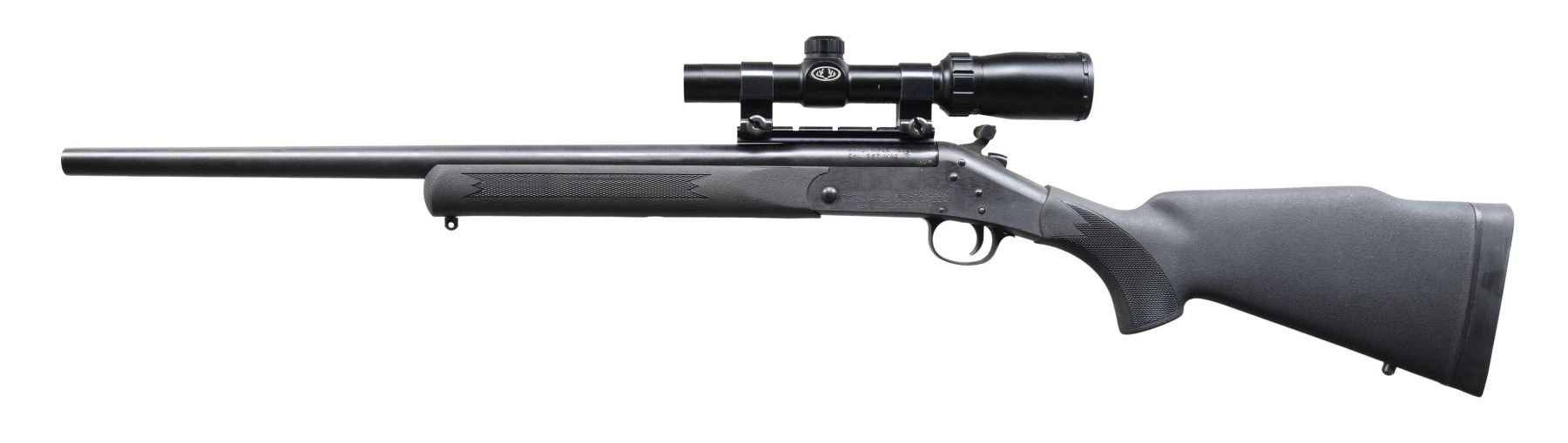 BREAK ACTION RIFLE. Cal. 357 Mag. S# CAC080592. Bbl. 22". Model SB2 single shot break action rifle mfg. by Harrington & Richardson. Left side of the bbl. is marked "HANDI RIFLE SB2" above the cal. designation, with H&R's mfg. information, as well as the S# marked on the left side of the receiver. Metal components exhibit a blue finish overall. Checkered black synthetic Monte Carlo pistol grip buttstock and forend, with black plastic trigger guard. Receiver is mounted with a Bushnell 1.5-4.5x scope. CONDITION: metal components retain the majority of their original factory blue finish, exhibiting a few superficial handling marks overall. Brilliant mirror bore, exhibiting well-defined rifling throughout. Synthetic furniture is excellent overall. Scope retains a clear and sharp optic. (24-4353/MLW). MODERN. $275-350.