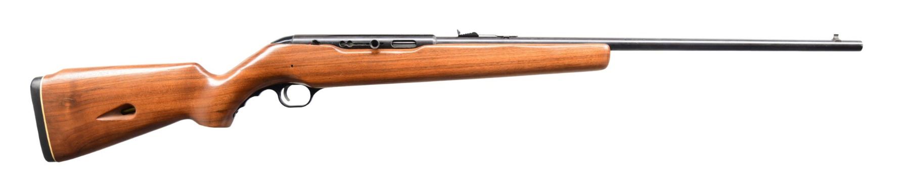 Cal. 22 LR. NSN. Bbl. 23". Bead front sight. U-notch rear sight. Receiver is grooved for sight mounting. Blued finish. Tube-fed semi-auto rimfire rifle mfg. 1960-1968. Hardwood stock. CONDITION: stock shows scattered handling marks. Metal retains 60% original blue with scattered fading to brown and freckling. Action appears to function properly when hand-cycled. Very good bore. (24-3908/MJC). CURIO. $150-250.