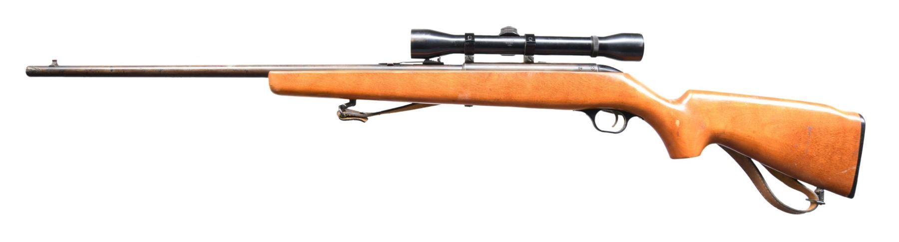 Cal. 22 S, L, LR. S#. NSN. Bbl. 24" with dovetailed bead front sight. Dovetailed elevator adjustable U notch rear sight. Weaver K4-C3 fine crosshair scope. Smooth pistol grip stock with QD sling swivels, leather sling, & plastic buttplate. Mfg. by Mossberg. CONDITION: Metal is void of finish with old cleaned heavy pitting. Stock has scattered moderate and heavy dings. Nice bore. MODERN (24-4357/ZAL) $50-100