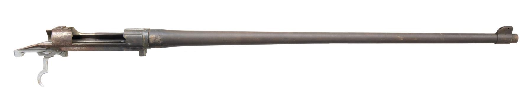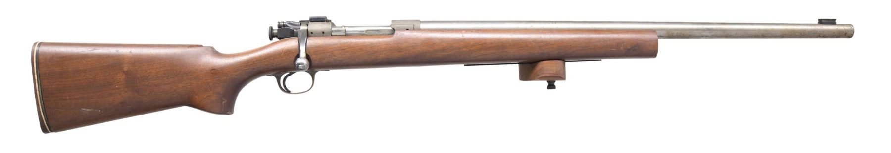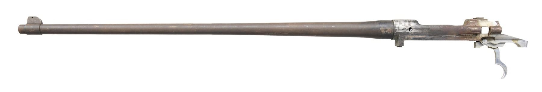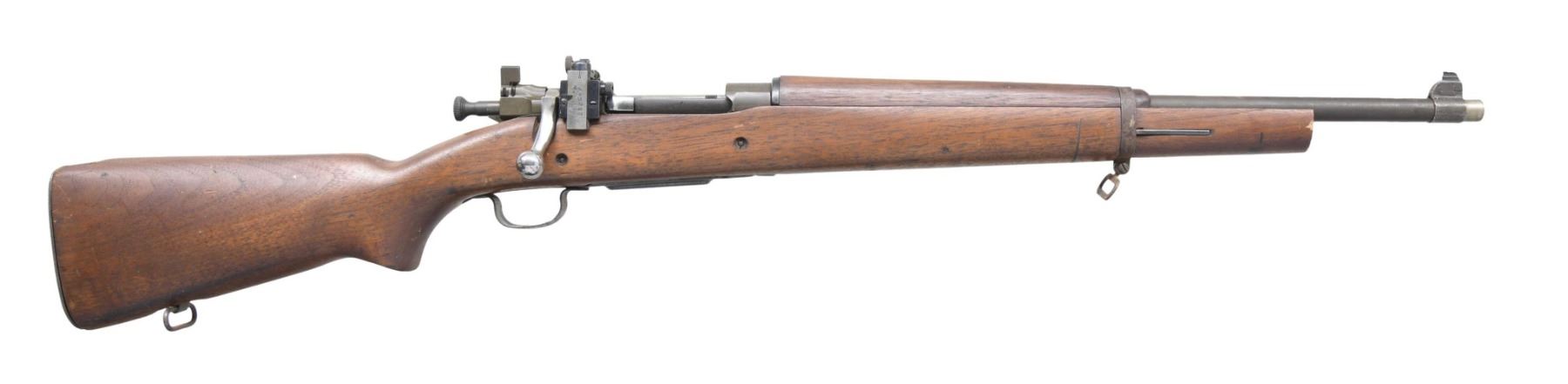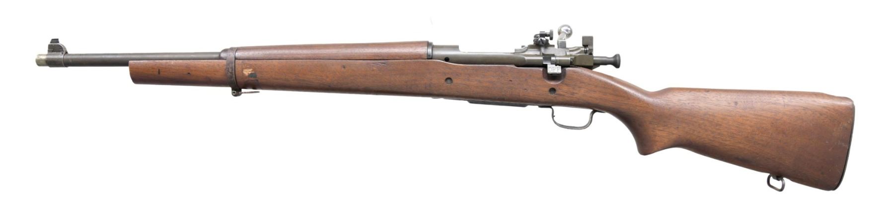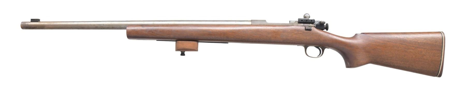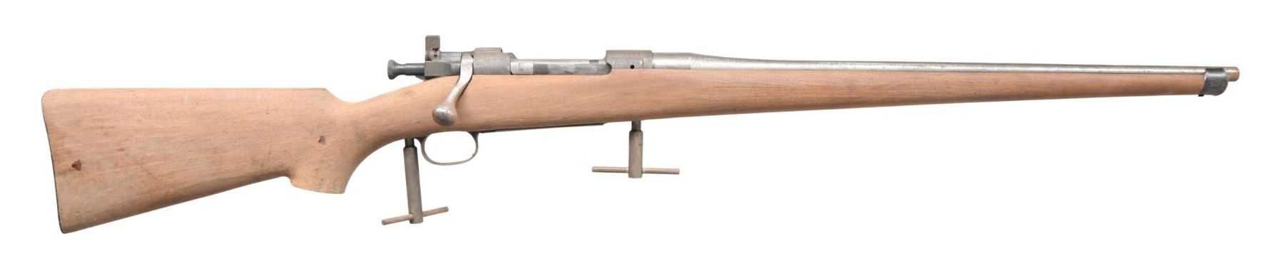 GUN 1: Springfield Model 1903 Sporterized Bolt Action Rifle. Cal. 7mm-08. S# 507002. Bbl. 21 3/4". Receiver mfg. in 1912. No sights are fitted. Custom bolt handle. Cutoff assembly, mag. follower, spring & trigger assembly are not present. Walnut Mannlicher type sporting stock w/ cheekpiece & fine checkered steel buttplate. Grip cap is not present. Steel forend tip is loosely installed. Rifle is assembled using stock maker's screws. CONDITION: stock is unfinished & shows extensive sanding marks. Bbl., receiver & bolt are in the white w/ extensive surface oxidation. Balance of metal parts are also oxidized. Very good shiny bore. (24-4897/RW). GUN 2: Custom Sporterized Remington Model 03-A3 Bolt Action Rifle. Cal. 30-06. S# 3940115. Bbl. 19 3/4". Rifle is Model 1903A3. Bbl. has been shortened & a Model 1903 front sight has been installed which includes a Marbles bead blade. Receiver fitted w/ Lyman Model 48S O3A3 receiver sight w/ stay set knobs. Slide graduated to 60 points. Bolt has been altered to low scope profile & has Smith Corona shroud. Trigger assembly, follower & mag. spring are not present. All stamped furniture including small bow trigger guard. Full pistol grip stock has been shortened approx. 5" beyond lower band. Handguard is present. CONDITION: stock set has moderately worn original finish w/ numerous handling marks & light staining. Forend tip is as cut. Metal parts except the polished bolt retain 75% original finish w/ light oxidation & fine pitting. Notable oxidation & pitting on stamped parts. Very good shiny 4 groove bore. (24-4911/RW). GUN 3: Custom Heavy 22 LR Single Shot Target Rifle. Cal. 22 LR. S# 490586. Bbl. 26 1/8". Rifle assembled on a Model 1903 receiver which was produced in 1911. Heavy straight taper bbl. in the white has scope block mounted near muzzle. Receiver bridge has adapter for target type rear sight which is not present. Bolt is from Springfield M2 Target Rifle. Handle has been altered to low profile. Adj. target trigger. Heavy walnut target stock w/ white line buttpad. Beavertail forend & fitted w/ forend rail & custom walnut hand-stop. CONDITION: stock has moderate wear, staining & handling marks. Nose of cone has been cut to clear cocking piece when bolt is removed. 1" crack behind receiver tang. Front trigger guard screw is not present. Metal is in the white turning gray w/ extensive light surface oxidation. Very good shiny bore. (24-4916/RW). GUN 4: U.S. Remington Model 03A3 Barreled Receiver With Trigger Assembly. Cal. 30-06. S# 8471422. Bbl. 24". Marked "RA", "flaming bomb" & "6-44". Front sight base is present. Receiver & trigger assembly have been partially polished. CONDITION: receiver has light surface oxidation & very fine pitting. Receiver ring shows discoloration from heat source. Bbl. has original Parkerized finish w/ wrench marks at the rear. Very good shiny 2 groove bore. (24-4921/RW). ALL MODERNS. $450-700.