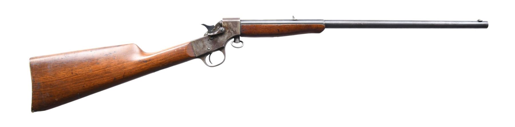 This lot consists of the following Stevens Falling Block Rifles: 1) STEVENS CRACK SHOT FALLING BLOCK RIFLE. Cal. 22 LR. S# Y733. Bbl. 20" part-rnd part-oct. Blade front sight. V-notch rear sight. Single shot takedown Stevens rifle. Hardwood stock set. CONDITION: stock has a notable chip missing at toe, a long repaired 6 1/2" chip on comb, a couple small cracks, scattered dings & handling wear. Metal is mostly a gray patina with scattered oxidation & traces of original blue. Action appears to function properly when hand cycled. Dark pitted poor bore. (24-5052/MJC). 2) STEVENS FALLING BLOCK RIFLE. Cal. 32L (32 Long). S# 12394. Bbl. 22" part-oct part-rnd. Blade front sight. V-notch rear sight. Takedown Stevens Falling block rifle. Hardwood stock set. Both sides of butt have several carvings including words. CONDITION: left side of butt has screw repair, scattered dings & handling wear. Metal is a mix of silver & gray colors with some pitting, scattered oxidation & dings. Action appears to function when hand cycled. Pitted bore. (24-5105/MJC). 3) STEVENS FALLING BLOCK RIFLE. Cal. 22 LR. S# 88. Bbl. 23" part-oct & part-rnd. Blade front sight. U-notch rear sight. Takedown falling block rifle. Blued bbl. Hardwood stock set. CONDITION: stock set shows a few chips, couple cracks, flaking finish, dings & handling marks. Action is a smoky gray patina with traces of original case colors & scattered oxidation. Bbl. retains 60% blue with a patch of pitting, scattered oxidation, fading & some dings. Action appears functional when hand cycled. Bore is bright with strong rifling but scattered patches of pitting. (24-5107/MJC). ALL CURIO. $450-750 for lot.