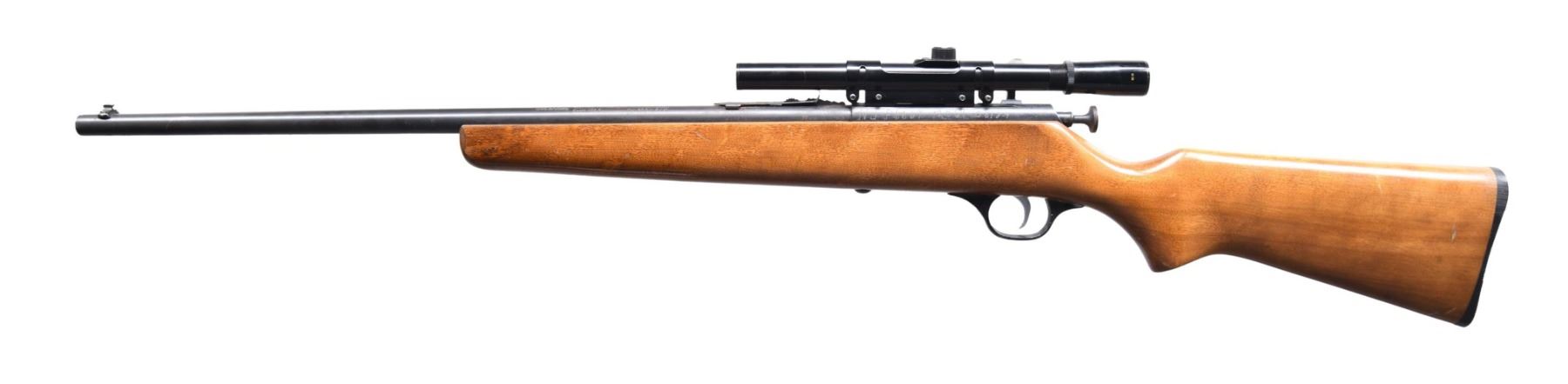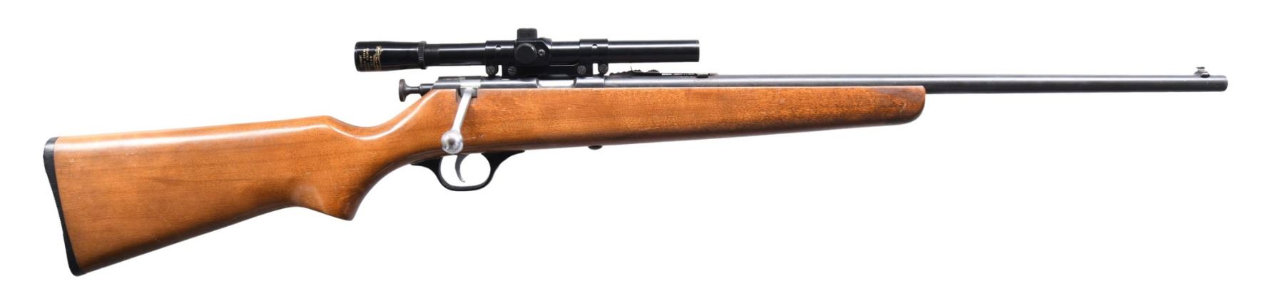 1) MARLIN MODEL 100G SINGLE SHOT BOLT ACTION RIFLE. Cal. 22 S, L, LR. NSN. Bbl. 22". Model 100G single shot bolt action rifle mfg. for Marlin by Glenfield Products. Top of the bbl. is marked "MARLIN", followed by Glenfield Products mfg. information, above the model and cal. designations. Left side of the receiver is hand inscribed "NJ P6667 12061 08184". Metal components exhibit a blue finish overall, save for on the bolt and trigger, which exhibit a nickel plated finish. 1-piece plain wood pistol grip buttstock, with black plastic trigger guard. Brass beaded blade front sight, with U-notch rear sight. Receiver is mounted with a Kmart All Pro 4x15 scope. CONDITION: metal components retain the majority of their factory blue finish, exhibiting some mild wear and thinning, with varying degrees of surface oxidation overall. Bolt knob shows some flaking. Mirror bore, exhibiting well defined rifling throughout. Stock shows scattered marks and a few minor impressions from handling and storage. Scope retains a clear optic. (24-5071/MLW). 2) MARLIN MODEL 80 BOLT ACTION RIFLE. Cal. 22 S, L, LR. NSN. Bbl. 24 1/8". Model 80 bolt action rifle mfg. by Marlin. Top of the bbl. is marked with Marlin's mfg. information, as well as the model and cal. designations. Metal components exhibit a blue finish overall. Plain 1-piece pistol grip buttstock with black plastic trigger guard. Stock appears to have been lightly sanded and revarnished. Blade front sight, with V-notch rear sight. MAGS: 1 7-rd. CONDITION: metal components retain the majority of their original factory blue finish, exhibiting some areas of wear and thinning, scattered superficial handling marks, as well as scattered spots of mild surface oxidation overall. Mirror bore, exhibiting well defined rifling throughout. Stock shows some scattered marks from handling and storage, but otherwise remains sturdy and serviceable. (24-5095/MLW). 3) MARLIN MODEL 80-DL BOLT ACTION RIFLE. Cal. 22 S, L, LR. NSN. Bbl. 24 1/8". Model 80-DL bolt action rifle mfg. by Marlin. Top of the bbl. is marked with Marlin's mfg. information, as well as the model and cal. designations. Metal components exhibit a blue finish overall. 1-piece plain wood pistol grip buttstock, with black plastic trigger guard. Stock has been lightly sanded and revarnished and is fitted with a black nylon sling. Ramped aluminum beaded blade front sight, with U-notch rear sight. MAGS: 1 7-rd. CONDITION: metal components retain traces of their original factory blue finish, exhibiting wear and thinning overall that shows through to gray and brown patinas, with some scattered spots of oxidation. Mirror bore, exhibiting well defined rifling throughout. Stock shows some scattered marks from handling and storage, but otherwise remains sturdy and serviceable. (24-5096/MLW). 4) MARLIN MODEL 100 SINGLE SHOT BOLT ACTION RIFLE. Cal. 22 S, L, LR. NSN. Bbl. 22". Model 100 single shot bolt action rifle mfg. by Marlin. Left side of the bbl. is marked with Marlin's mfg. information, above the model and cal. designations. Metal components exhibit a reapplied blue finish overall. 1-piece plain wood pistol grip stock appears to have been lightly sanded and revarnished at one time. Brass beaded blade front sight, with U-notch rear sight. Receiver is fitted with a Simmons 3x-7x20 scope. CONDITION: metal components retain bountiful amounts of their reapplied blue finish, exhibiting some light wear, scattered spots of mild surface oxidation, as well as some spots of pitting beneath the finish overall. Mirror bore, exhibiting well defined rifling throughout. Stock exhibits some scattered marks from handling and storage, but otherwise remains sturdy and serviceable. Scope is slightly hazy. (24-5112/MLW). ALL CURIO. $350-550.