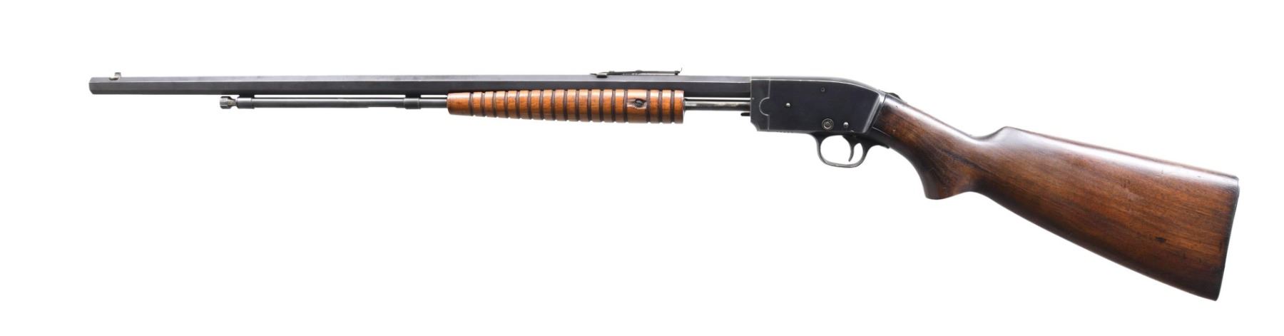 1) SAVAGE 1914 PUMP ACTION RIFLE. Cal 22 S, L & LR. S# 33690. Bbl. 24" oct. Bead front sight. Sporting style rear sight. Upper tang has two screw holes present for further sight mounting. Tube fed rimfire rifle. Blued finish. Blued finish. Pistol grip walnut stock & grooved forend. Forend is lighter in color than buttstock. CONDITION: stock set shows a few cracks behind frame, a few scattered chips & handling marks. Metal retains 85% original blue with scattered edge wear, light oxidation & handling wear. Action functions properly when hand cycled. Worn bore with scattered patches of pitting. (24-5094/MJC). 2) SAVAGE MODEL 3B BOLT ACTION RIFLE. Cal. 22 RF. NSN. Bbl. 24" rnd. Gold bead front sight. Sporting style rear sight. Receiver mounted Lyman 55S aperture rear sight. Single shot bolt action rifle. Blued finish. Walnut pistol grip stock. CONDITION: sanded stock has added varnish with scattered flaking & handling wear. Metal retains 60% blue with areas turning gray, some light oxidation, edge wear & dings. Action functions properly when hand cycled. Very good bore. (24-5100/MJC). BOTH CURIO. $375-500 for pair.