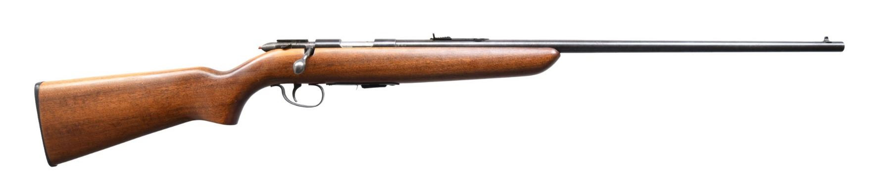 1) REMINGTON MODEL 511 SCOREMASTER BOLT ACTION RIFLE. Cal. 22 S, L ,LR. NSN. Bbl. 25". Model 511 Scoremaster bolt action rifle mfg. by Remington. Top of the bbl. is marked with Remington's mfg. and patent information, followed by the model designation, with the Remington trademark logo and the cal. designation marked towards the breech. Metal components exhibit a blue finish overall, save for on the bolt body, which is polished in-the-white. Plain wood pistol grip buttstock appears to have been sanded and revarnished. Aluminum beaded blade front sight, with V-notch rear sight. MAGS: one 5-rd. CONDITION: metal components retain large amounts of their original blue finish, exhibiting wear and thinning that shows through to gray and brown patinas, with scattered spots of light to mild surface oxidation present overall. Mirror bore, exhibiting well-defined rifling throughout. Stock shows some scattered marks and minor impressions from handling and storage, but otherwise remains sturdy and serviceable. (24-5965/MLW). CURIO. 2) MARLIN GLENFIELD MODEL 81G BOLT ACTION RIFLE. Cal. 22 S, L, LR. NSN. Bbl. 22". Glenfield Model 81G bolt action rifle mfg. by Marlin. Left side of the bbl. exhibits markings stipulating Marlin's mfg. information, as well as the model and cal. designations. Metal components exhibit a blue finish overall, save for on the bolt body, which is polished in-the-white. Bolt handle exhibits a nickel-plated finish. Plain wood pistol grip buttstock with black plastic trigger guard. Brass beaded blade front sight with U-notch rear sight. Receiver is mounted with a Sears Ted Williams 4x scope. CONDITION: very good, with metal components retaining the majority of their original factory finishes, exhibiting some scattered superficial handling marks as well as some small spots of light surface oxidation. Mirror bore, exhibiting strong rifling throughout. Stock shows a few marks and minor impressions from handling and storage, but otherwise remains sturdy and serviceable. Scope is slightly hazy but otherwise retains a good optic. (24-5966/MLW). BOTH CURIO. $300-500.