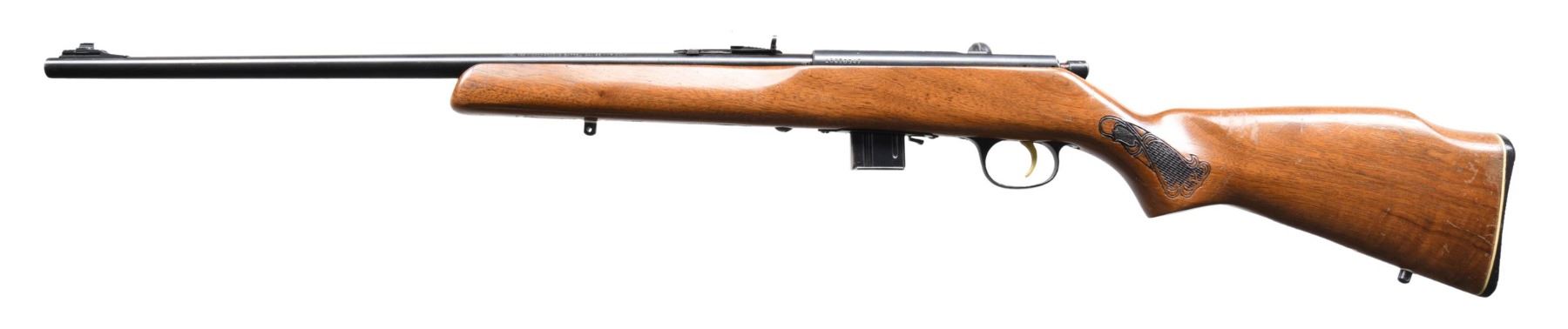 1) M782. S# 25670947. Bbl. 22" with dovetailed bead ramp mounted front sight and dovetailed elevator adjustable semi-buckhorn rear sight. Grooved receiver, Stylized checkered pistol grip walnut stock with raised cheekrest, sling studs, & checkered Marlin buttplate. MAGS: 1-10rd. CONDITION: Overall very fine with a little very mild muzzle wear. Stock has some mild scattered handling marks. Nice bore. MODERN (24-5946/ZAL). 2) MODEL 25M. Cal. 22 WMR. S# 15678648. Bbl. 22" with bladed ramp front sight and dovetailed elevator adjustable rear sight. Grooved receiver. Smooth hardwood stock with raised cheekrest, sling studs and checkered plastic buttplate. MAGS: 1-10rd. CONDITION: Barrel has strong blue with some light muzzle wear, some small splotches, & some fine pinprick oxidation. Stock has some light handling marks. Nice bore. MODERN (24-5947/ZAL) $300-450 for pair