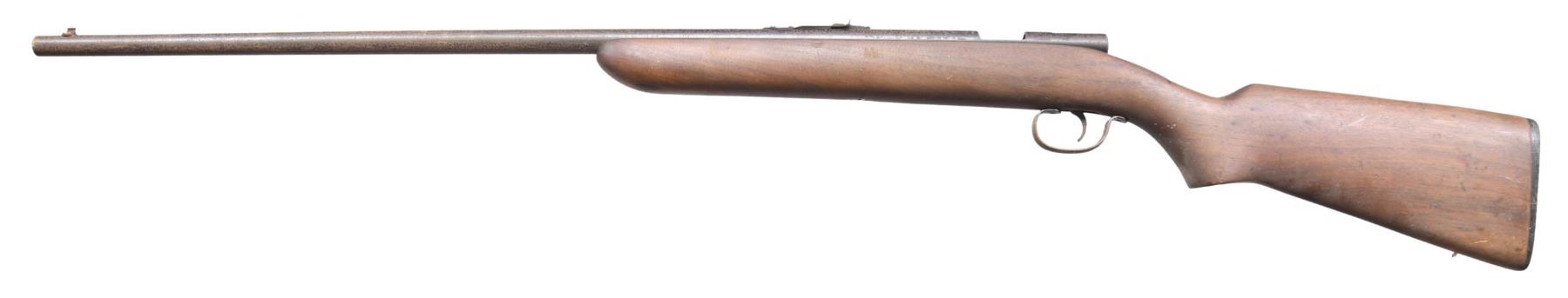 1) REMINGTON MODEL 41 TARGETMASTER SINGLE SHOT BOLT ACTION RIFLE. Cal. 22 S, L, LR. NSN. Bbl. 27". Model 41 Targetmaster single shot bolt action rifle mfg. by Remington. Standard markings. Metal components exhibit a blue finish. Plain wood pistol grip buttstock. Brass beaded blade front sight, with U-notch rear sight. Bolt assembly is absent. CONDITION: metal components retain large amounts of their original blue finish, exhibiting varying degrees of oxidation overall. Mirror bore, with strong rifling throughout. Stock shows scattered marks and impressions from handling and storage, but otherwise remains sturdy and serviceable. (24-4881/MLW). CURIO. 2) SPRINGFIELD / STEVENS MODEL 87 SEMI-AUTOMATIC RIFLE. Cal. 22 S, L, LR. NSN. Bbl. 23 7/8". Springfield Model 87A semi-automatic rifle mfg. by Stevens. Standard markings. Metal components exhibit a blue finish, with the alloy trigger guard exhibiting a black enamel finish. Plain wood pistol grip buttstock. Blade front sight, with U-notch rear sight. CONDITION: metal components retain large amounts of their original blue finish, exhibiting varying degrees of oxidation overall. Trigger guard exhibits flaking overall. Very bright bore, with some spots of pitting and strong rifling throughout. Stock shows numerous marks from handling and storage, but otherwise remains sturdy and serviceable. (24-4882/MLW). CURIO. 3) STEVENS FALLING BLOCK SINGLE SHOT RIFLE. Cal. 22 RF. S# 27. Bbl. 19 3/8". Single shot falling block rifle mfg. by Stevens. Case color hardened receiver, breechblock, hammer, and lever, with blued contemporary heavy bbl. Plain wood pistol grip buttstock and forend. White beaded blade front sight. Rear sight is absent. Bbl. is fitted with an optic rail. CONDITION: case colored components retain traces of their original finish, with the balance exhibiting a gray patina and varying degrees of oxidation overall. Bbl. exhibits oxidation overall. Mirror bore, exhibiting well defined rifling throughout. Wood furniture shows scattered marks from handling and storage, but otherwise remains sturdy and serviceable. (24-4883/MLW). CURIO. 4) MOSSBERG MODEL 152 SEMI-AUTOMATIC RIFLE. Cal. 22 LR. NSN. Bbl. 18 1/8". Model 152 semi-automatic rifle mfg. by Mossberg. Standard markings. Metal components exhibit a blue finish overall. Plain wood pistol grip stock, folding forend, and black polymer trigger guard. Sights and mag. are absent. CONDITION: metal components retain large amounts of their original blue finish, exhibiting varying degrees of oxidation overall. Very bright bore, exhibiting strong rifling throughout. Stock exhibits scattered marks from handling and storage, with a crack present on the butt on the left side. (24-4887/MLW). CURIO. 5) MARLIN MODEL 25 BOLT ACTION RIFLE. Cal. 22 S, L, LR. S# 13656157. Bbl. 22". Model 25 bolt action rifle mfg. by Marlin. Standard markings. Metal components exhibit a blue finish. Plain wood pistol grip buttstock with aluminum trigger guard. Receiver is taped to the stock. Ramped blade front sight, with square notch rear sight. Mag. is absent. CONDITION: metal components retain large amounts of their original factory finish, exhibiting some wear, with scattered areas of surface oxidation present overall. Very bright bore, retaining well defined rifling throughout. Stock exhibits scattered marks from handling and storage, but otherwise remains sturdy and serviceable. (24-4890/MLW). MODERN. 6) HARRINGTON & RICHARDSON MODEL 265 TARGETEER BOLT ACTION RIFLE. Cal. 22 LR. S# 15115-0. Bbl. 22". Model 265 Targeteer bolt action rifle mfg. by Harrington & Richardson. Standard markings. Metal components exhibit a blue finish overall. Plain wood pistol grip buttstock, with black plastic trigger guard. Blade front sight, with U-notch rear sight and aperture rear sight. Mag. is absent. CONDITION: metal components retain large amounts of their original blue finish, exhibiting varying degrees of oxidation overall. Very bright bore, exhibiting some light pitting, while retaining well defined rifling throughout. Wood stock shows scattered marks and scratches from handling and storage, but otherwise remains sturdy and serviceable. (24-4891/MLW). CURIO. 7) REMINGTON PUMP ACTION RIFLE BARRELED ACTION. Cal. 22 S, L, LR. S# 308449. Bbl. 23 7/8". Pump action bbl.'d action mfg. by Remington. Standard markings. Metal components exhibit a blue finish. Wood hardware, sights, and mag. tube are absent. CONDITION: metal components retain poor amounts of their original blue finish, exhibiting varying degrees of oxidation and pitting overall. Dark pitted bore, retaining poor rifling throughout. (24-4481/MLW). MODERN. 8) SAVAGE STEVENS MODEL 87T SEMI-AUTOMATIC RIFLE. Cal. 22 S, L, LR. NSN. Bbl. 24". Stevens Model 87T semi-automatic rifle mfg. by Savage. Standard markings. Metal components exhibit a blue finish. 1-piece checkered mottled brown plastic stock, with aluminum trigger guard. Blade front sight, with U-notch rear sight. CONDITION: metal components retain fair amounts of their original blue finish, exhibiting varying degrees of oxidation overall. Very bright bore, exhibiting strong rifling throughout. Stock exhibits scattered handling marks and areas of discoloration overall, but otherwise remains sturdy and serviceable. (24-4918/MLW). MODERN. $250-350.