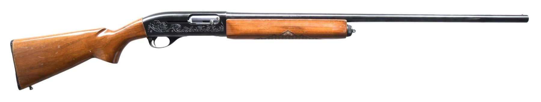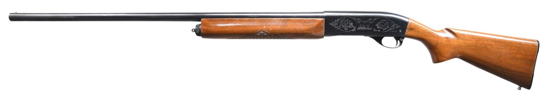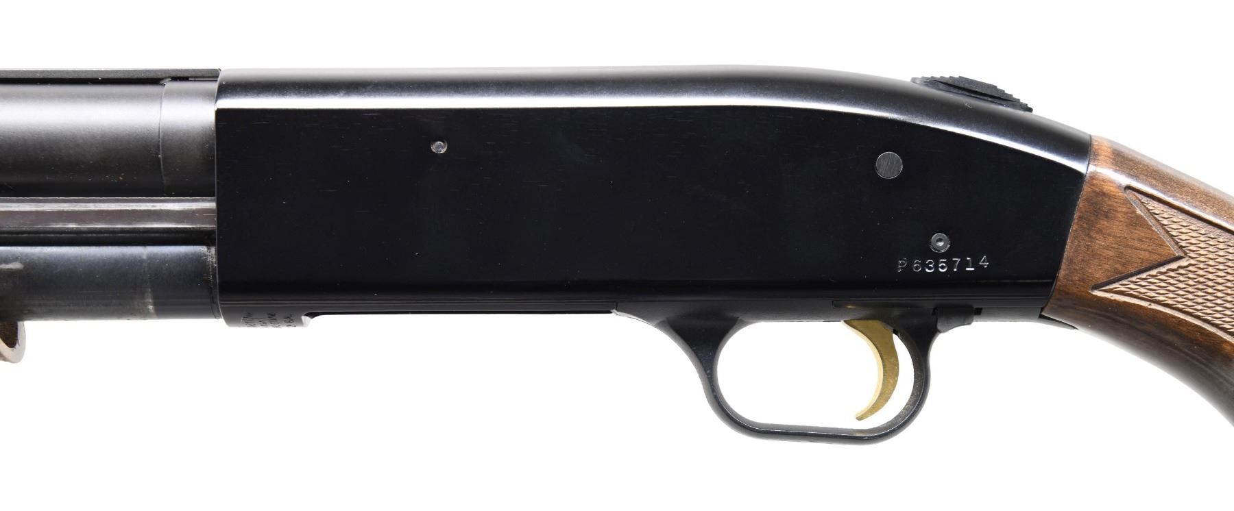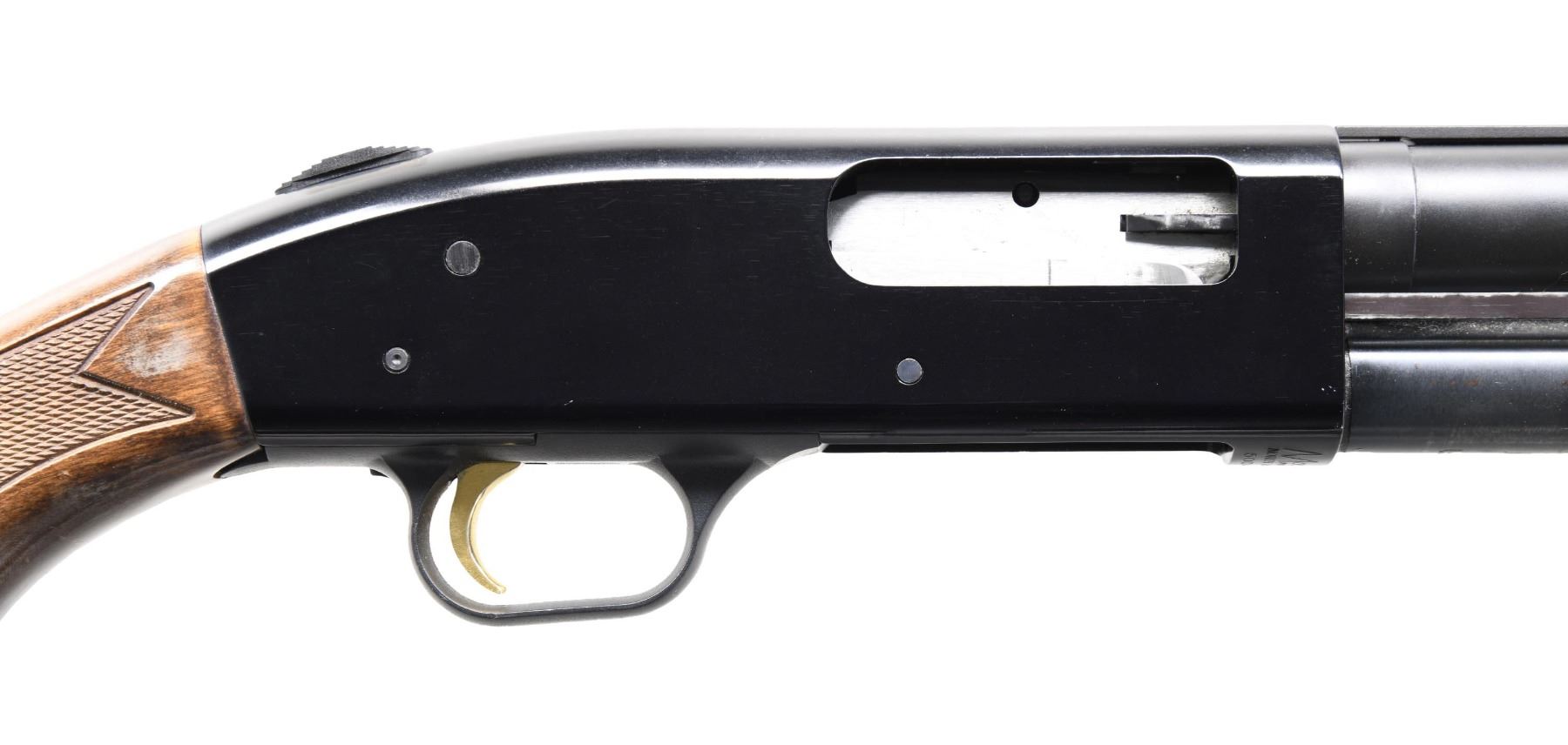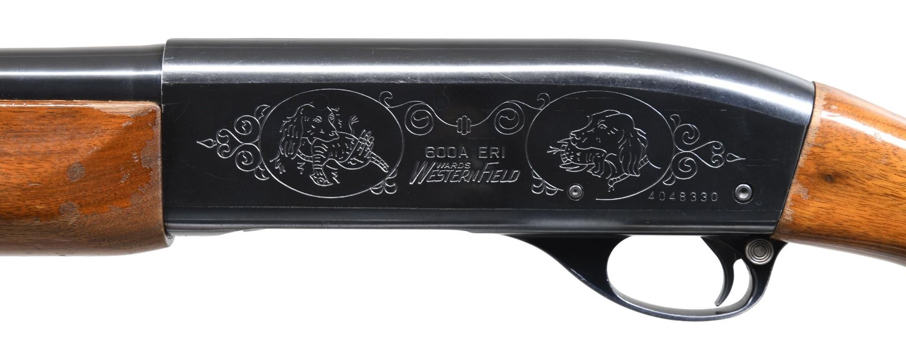 1) REMINGTON / WARDS WESTERNFIELD MODEL 600A ERI SEMI-AUTOMATIC SHOTGUN. Cal. 12 GA, 2 3/4". S# 4048330. Bbl. 30". Model 600A ERI semi-automatic shotgun mfg. by Remington for Wards Westernfield. Standard markings overall. Metal components exhibit a blue finish, save for the bolt, which is polished in-the-white, as well as the aluminum trigger guard, which exhibits a black enamel type finish. Plain wood pistol grip buttstock with checkered wood forend. Fixed full choke bbl. with aluminum bead front sight. CONDITION: metal components retain the majority of their original factory finishes, exhibiting some mild edge wear, scattered superficial handling marks, as well as some scattered spots of light surface oxidation overall. Mirror bore. Wood furniture shows flaking to their varnish, as well as scattered superficial marks from handling and storage, but otherwise remains sturdy and serviceable. (24-5492/MLW). CURIO. 2) MOSSBERG MODEL 500A PUMP ACTION SHOTGUN. Cal. 12 GA, 2 3/4" & 3". S# P635714. Bbl. 28". Model 500A pump action shotgun mfg. by Mossberg. Left side of the bbl. is marked with the cal. designation followed by "FOR MOSSBERG M500." Left side of the receiver is marked with the S#, with Mossberg's mfg. information, as well as the model and cal. designations marked on the underside. Aluminum receiver exhibits a black anodized finish, with the bbl. exhibiting a matte blue finish. Mag. tube exhibits a standard blue finish. Checkered wood pistol grip buttstock and pump, with black plastic trigger guard. Grooved V/R, with brass bead front sight and threaded Modified choke. Receiver has been drilled and tapped. CONDITION: excellent, with metal components retaining bountiful amounts of their original factory finishes, exhibiting some wear on the mag. tube from cycling of the action. Mirror bore. Wood furniture shows some minor superficial marks from handling and storage but otherwise remains sturdy and serviceable. (24-5942/MLW). MODERN. $300-500.