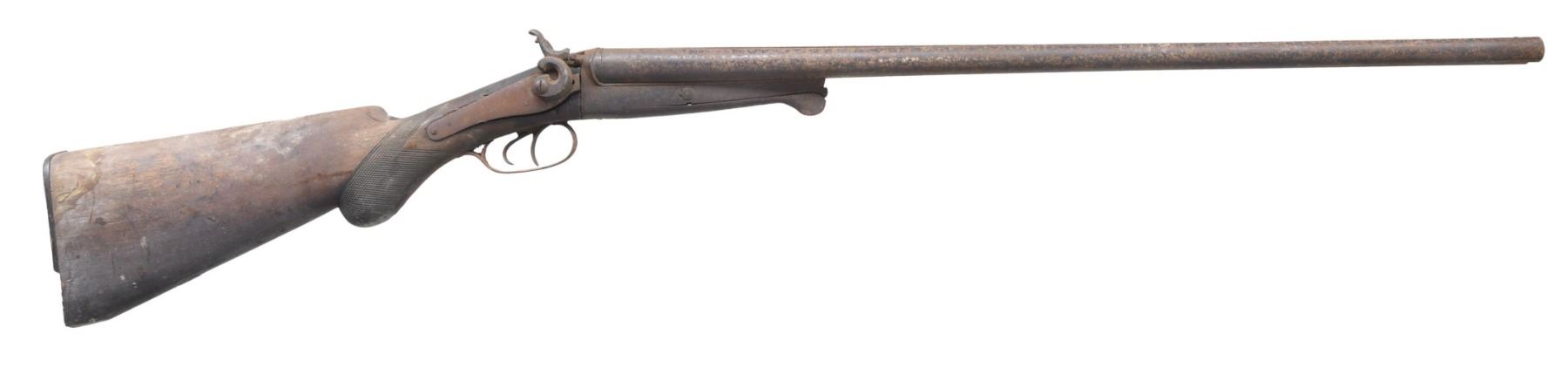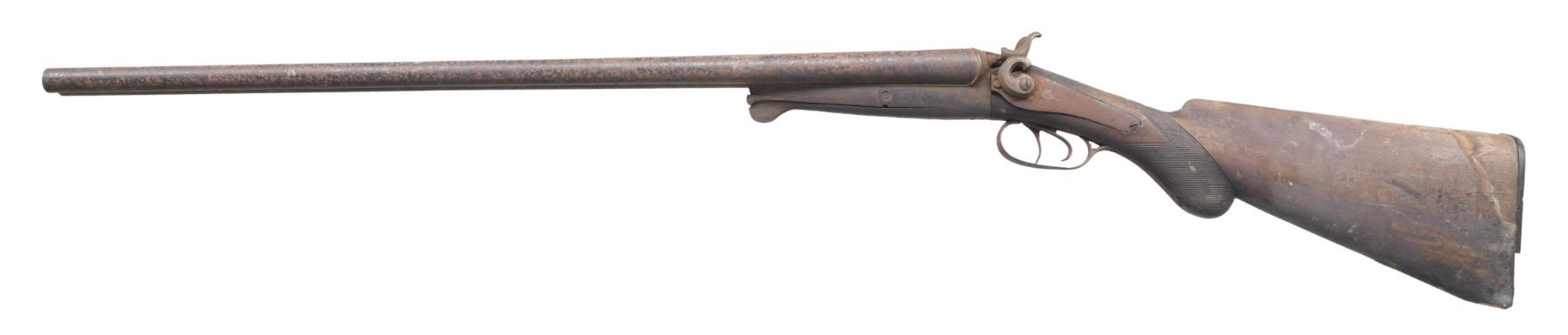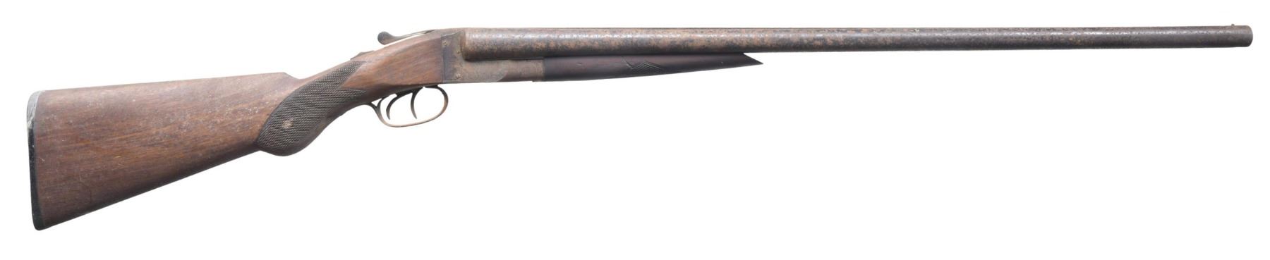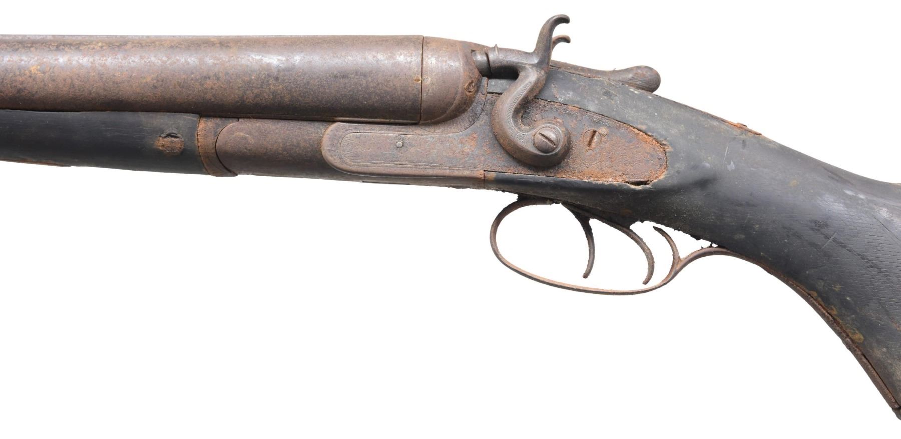 1) AMERICAN SXS HAMMER SHOTGUN. Cal. 10 Ga. NSN. Bbls. 32 1/2". Bead front sight. Hammer shotgun that appears to be of American mfg. Hardwood stock set. CONDITION: stock set shows overall staining, scattered cracks & chips. Metal shows overall oxidation with some pitting. Action not functioning properly. Dark oxidized bores. (24-4875/MJC). CURIO. 2) BELGIAN SXS HAMMER SHOTGUN. Cal. 20 Ga. NSN. Bbls. 27". Underlever sidehammer shotgun that appears to be missing a few small parts. Bottom half of buttplate missing. CONDITION: stock shows a few large chips, some cracks & notable staining. metal is an overall oxidized patina. Action not functioning & locks are loose of stock. Oxidized bores. (24-4879/MJC). CURIO. 3) FOX B BBL ACTION SXS SHOTGUN. Cal. 12 Ga 2 3/4. NSN. Bbls. 30". Bead front sight. Parts lot with frame, bbls., lever, safety, both triggers & trigger guard. CONDITION: metal shows overall oxidation & traces of original blue. Bores show scattered oxidation. (24-4886/MJC). MODERN. 4) KEYSTONE ARMS SXS SHOTGUN. Cal. 12 Ga. NSN. Bbls. 28". Bead front sight. Markings on bbl. obscured by oxidation. CONDITION: stock set shows outline of a sticker on left side, scattered flaking & staining. Metal shows overall oxidation with some pitting. Action not opening. Oxidized poor bores. (24-4893/MJC). CURIO. 5) BELGIAN HAMMER SXS SHOTGUN. Cal. 16 Ga. S# 9800. Bbls. 30". Bead front sight. Bbl. marked in part "BELGIUM PATENT" but markings obscured by oxidation. Parts gun that includes frame, bbls., stock set trigger assembly & lever. Lock assemblies not present. CONDITION: stock set shows overall staining, rot & some cracks. Metal shows overall oxidation. Action not functioning. Dark pitted bores. (24-4899/MJC). CURIO. $250-400 for lot.