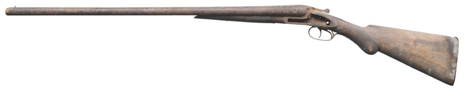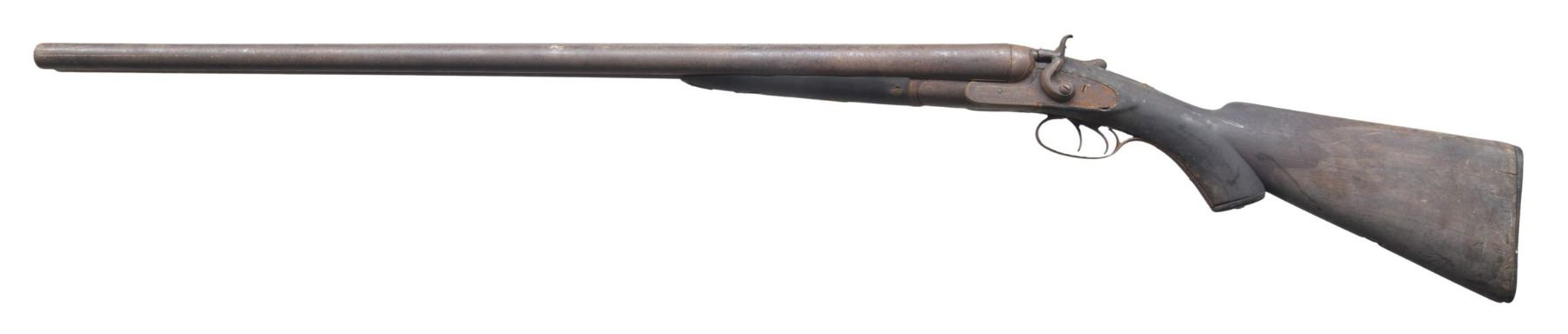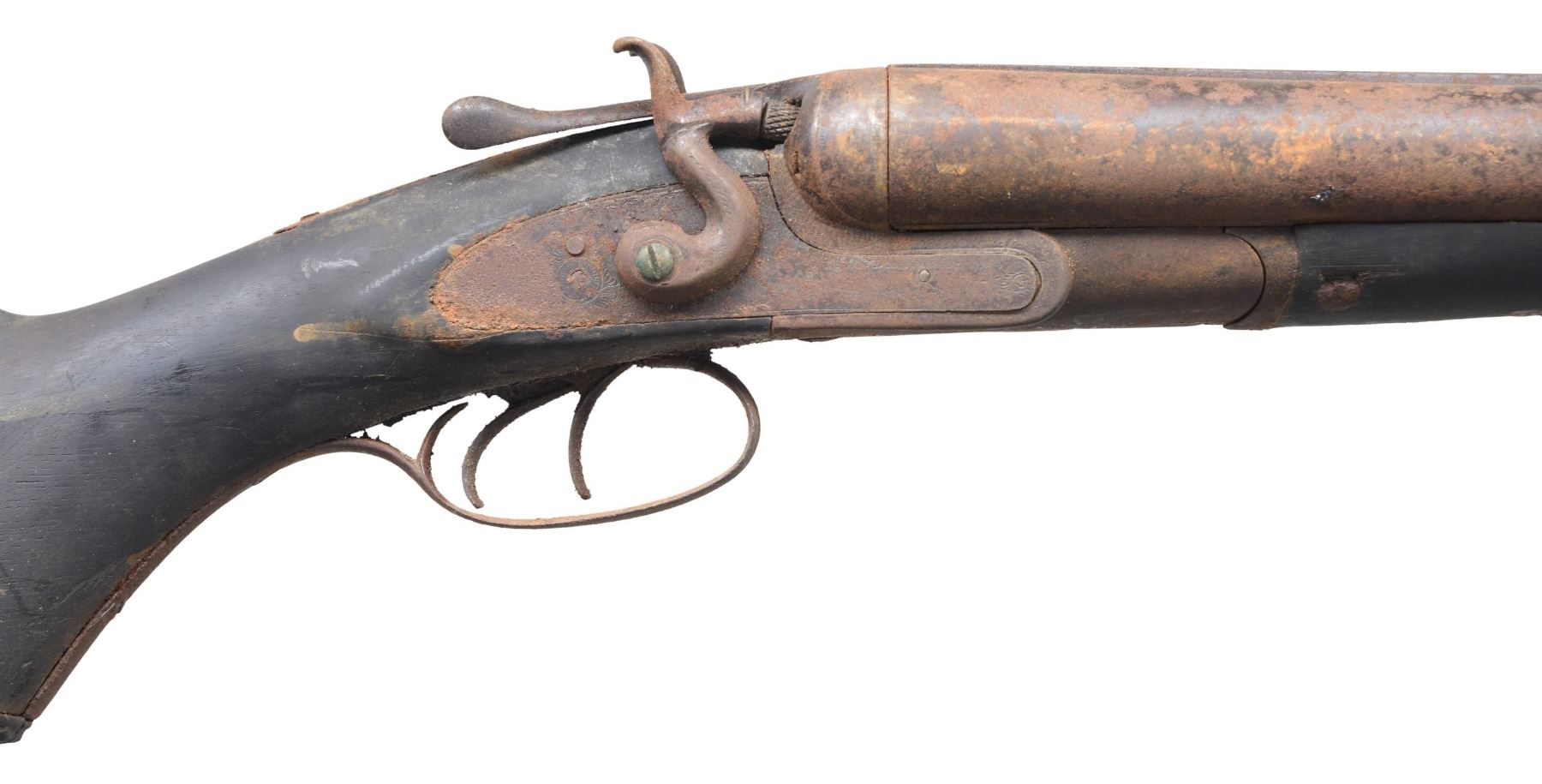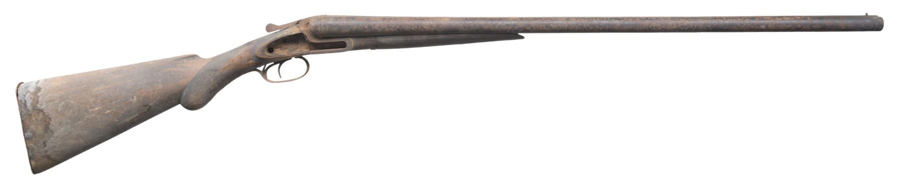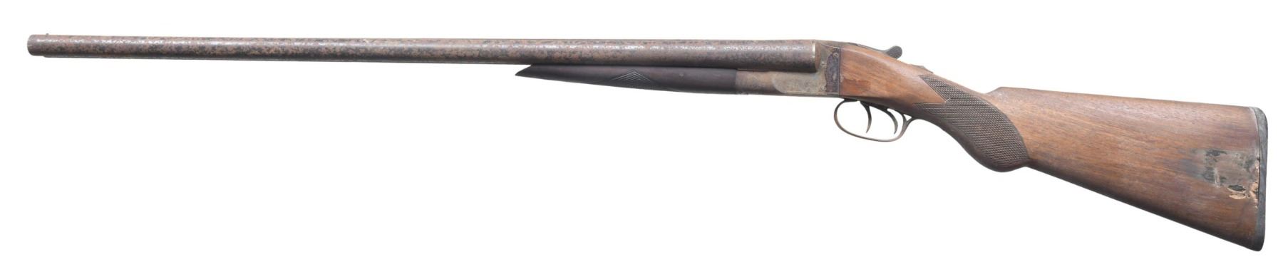 1) AMERICAN SXS HAMMER SHOTGUN. Cal. 10 Ga. NSN. Bbls. 32 1/2". Bead front sight. Hammer shotgun that appears to be of American mfg. Hardwood stock set. CONDITION: stock set shows overall staining, scattered cracks & chips. Metal shows overall oxidation with some pitting. Action not functioning properly. Dark oxidized bores. (24-4875/MJC). CURIO. 2) BELGIAN SXS HAMMER SHOTGUN. Cal. 20 Ga. NSN. Bbls. 27". Underlever sidehammer shotgun that appears to be missing a few small parts. Bottom half of buttplate missing. CONDITION: stock shows a few large chips, some cracks & notable staining. metal is an overall oxidized patina. Action not functioning & locks are loose of stock. Oxidized bores. (24-4879/MJC). CURIO. 3) FOX B BBL ACTION SXS SHOTGUN. Cal. 12 Ga 2 3/4. NSN. Bbls. 30". Bead front sight. Parts lot with frame, bbls., lever, safety, both triggers & trigger guard. CONDITION: metal shows overall oxidation & traces of original blue. Bores show scattered oxidation. (24-4886/MJC). MODERN. 4) KEYSTONE ARMS SXS SHOTGUN. Cal. 12 Ga. NSN. Bbls. 28". Bead front sight. Markings on bbl. obscured by oxidation. CONDITION: stock set shows outline of a sticker on left side, scattered flaking & staining. Metal shows overall oxidation with some pitting. Action not opening. Oxidized poor bores. (24-4893/MJC). CURIO. 5) BELGIAN HAMMER SXS SHOTGUN. Cal. 16 Ga. S# 9800. Bbls. 30". Bead front sight. Bbl. marked in part "BELGIUM PATENT" but markings obscured by oxidation. Parts gun that includes frame, bbls., stock set trigger assembly & lever. Lock assemblies not present. CONDITION: stock set shows overall staining, rot & some cracks. Metal shows overall oxidation. Action not functioning. Dark pitted bores. (24-4899/MJC). CURIO. $250-400 for lot.