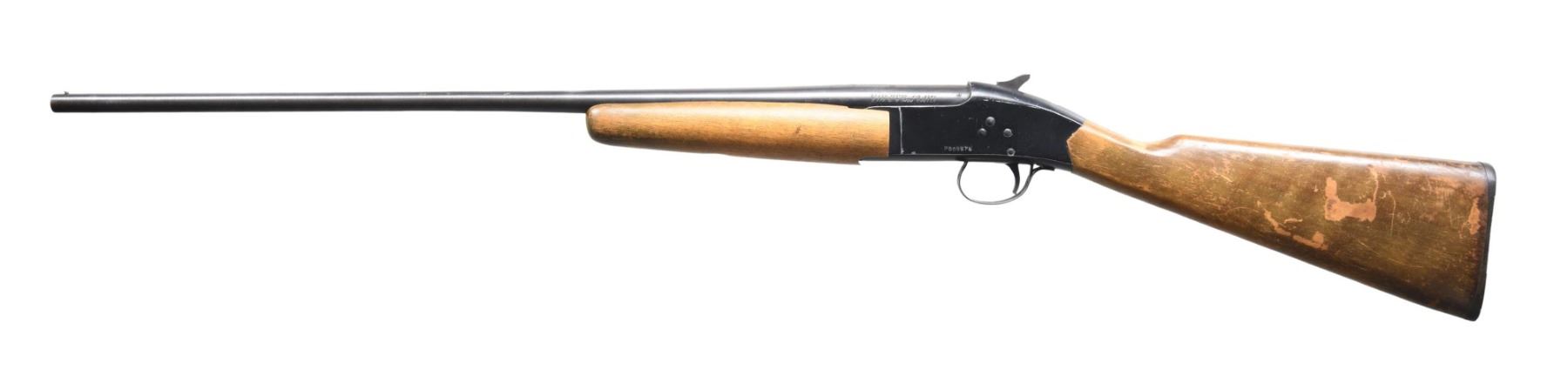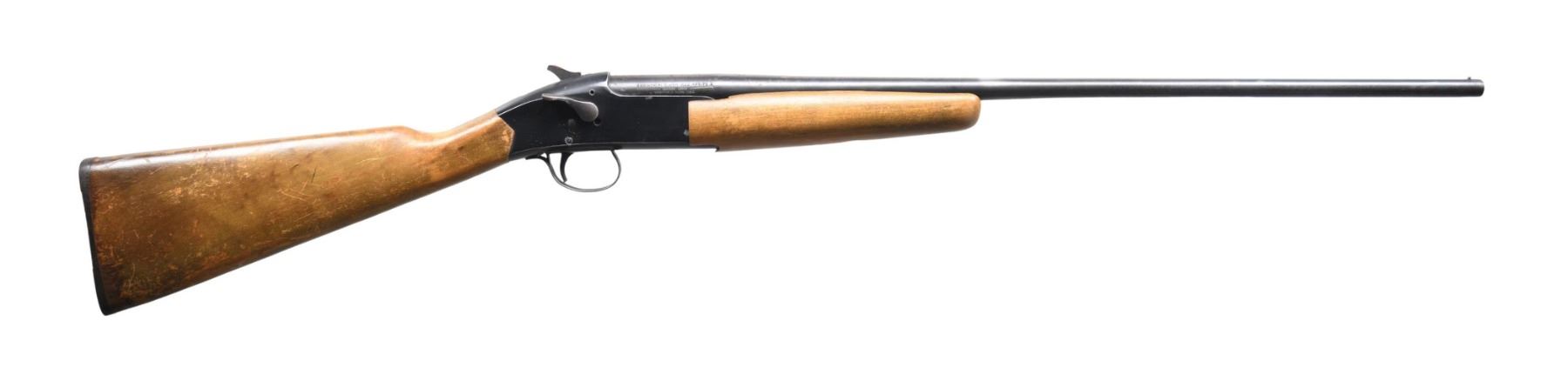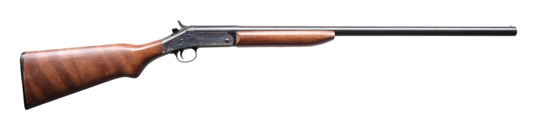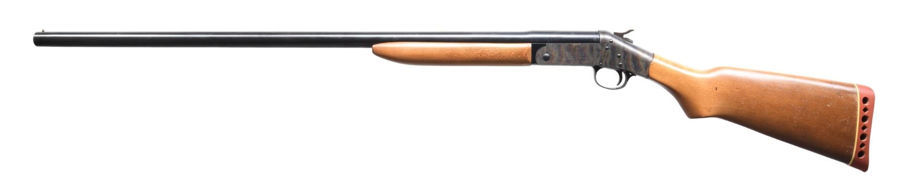 1) HARRINGTON & RICHARDSON TOPPER MODEL 88 SINGLE SHOT BREAK ACTION SHOTGUN. Cal. 12 GA, 3". S# AT353748. Bbl. 27 5/8". Topper Model 88 single shot break action shotgun mfg. by Harrington & Richardson. Top of the bbl. is marked with the model and cal. designations, followed by "MOD.". Left side of the receiver is marked with H&R's mfg. and patent information, above the S#. Receiver exhibits a case color hardened finish, with remaining metal components exhibiting a blue finish overall. Plain wood pistol grip buttstock and forend, with black polymer trigger guard. Brass bead front sight. CONDITION: receiver retains the majority of its original case color hardened finish, exhibiting fading on the underside, with scattered spots of light to mild surface oxidation. Blued parts retain the majority of their finish, exhibiting some light edge wear, with scattered spots of light to mild surface oxidation overall. Very bright bore, exhibiting some scattered spots of oxidation. Wood furniture shows scattered superficial marks from handling and storage, but otherwise remains sturdy and serviceable. (24-5973/MLW). 2) HARRINGTON & RICHARDSON TOPPER MODEL 158 SINGLE SHOT BREAK ACTION SHOTGUN. Cal. 12 GA, 2 3/4". NSN. Bbl. 30". Topper Model 158 single shot break action shotgun mfg. by Harrington & Richardson. Top of the bbl. is marked with the cal. designation, followed by "FULL". Left side of the receiver is marked with the model designation, above H&R's mfg. and patent information. Receiver exhibits a case color hardened finish, with remaining metal components exhibiting a blue finish overall. Plain wood pistol grip buttstock and forend, with black plastic trigger guard. Brass bead front sight. CONDITION: receiver retains large amounts of its original case color hardened finish, with the balance exhibiting some fading and varying degrees of surface oxidation overall. Bbl. retains the majority of its original blue finish, exhibiting scattered spots of light to mild surface oxidation overall. Mirror bore. Wood furniture shows some superficial marks and minor impressions from handling and storage, but otherwise remains sturdy and serviceable. (24-5974/MLW). 3) SAVAGE SPRINGFIELD MODEL 944 SERIES A SINGLE SHOT BREAK ACTION SHOTGUN. Cal. 410 GA, 2 1/2" & 3". S# P908575. Bbl. 26". Springfield Model 944 Series A single shot break action shotgun mfg. by Savage. Left side of the bbl. is marked with the cal. designation, with the model designation and Savage's mfg. information marked on the right. Aluminum receiver exhibits a black enamel type finish, with remaining metal components exhibiting a blue finish. Plain wood straight grip buttstock and forend. Aluminum bead front sight. CONDITION: receiver retains large amounts of its original finish, exhibiting scattered handling marks and mild edge wear overall. Blued parts retain the majority of their original finish, exhibiting some wear and thinning, as well as scattered spots of surface oxidation overall. Hammer is chipped at the tip. Bright bore, with firing residue throughout. Wood furniture shows wear to its finish, with scattered marks from handling and storage.(24-5975/MLW). ALL CURIO. $300-400.