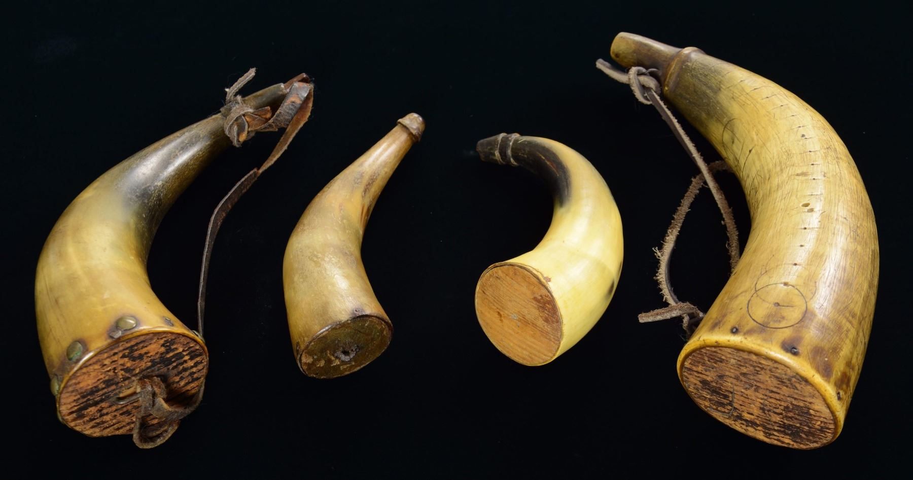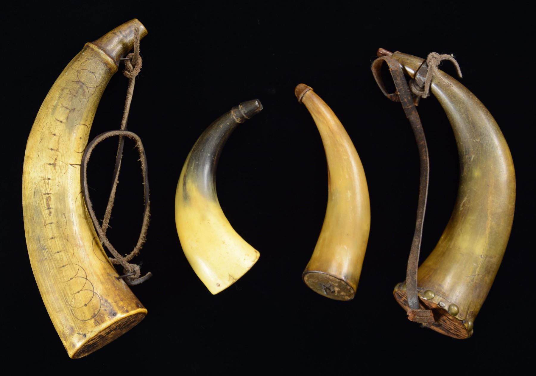 This lot includes 1 plain powder horn measuring 6 1/4" in length with a wooden plug in the butt. / 1 Plain powder horn measuring 6 3/4" in length with a wooden plug and iron loop in the butt. / 1 Plain powder horn measuring 9" in length with a wooden plug and iron staple in the butt. Domes brass tacks attach the horn to the butt, and the original wooden peg fits firmly in the spout. / 1 Geometrically decorated powder horn that appears to have the date "1818" carved in with the aid of a compass. The butt has a wooden plug, and the spout has an iron loop. CONDITION: all horns show age but are quite solid. (02-22941/BF). $300-450.