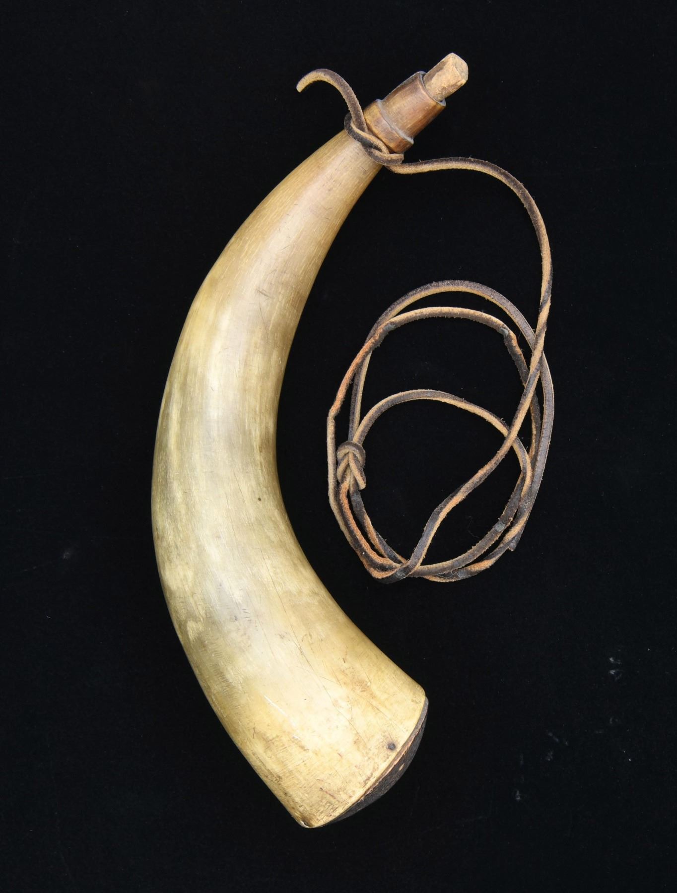 This plain, unengraved powder horn measures approx. 11” in length. It has a turned spout with a carved wooden plug. The butt has a dome-shaped plug and is secured with iron nails. The horn is undecorated and does come with a modern rawhide strap for display. UNATTACHED ACCESSORIES: a letter stating that the horn was used by William Price, who was the quartermaster on the Regimental Staff of the 1st Virginia Regiment during the Revolutionary War. According to the letter, he served from August 1775 to July 1779, and was wounded at the Battle of Stony Point. CONDITION: horn shows light wear overall. (02-23119/BF). $75-125.