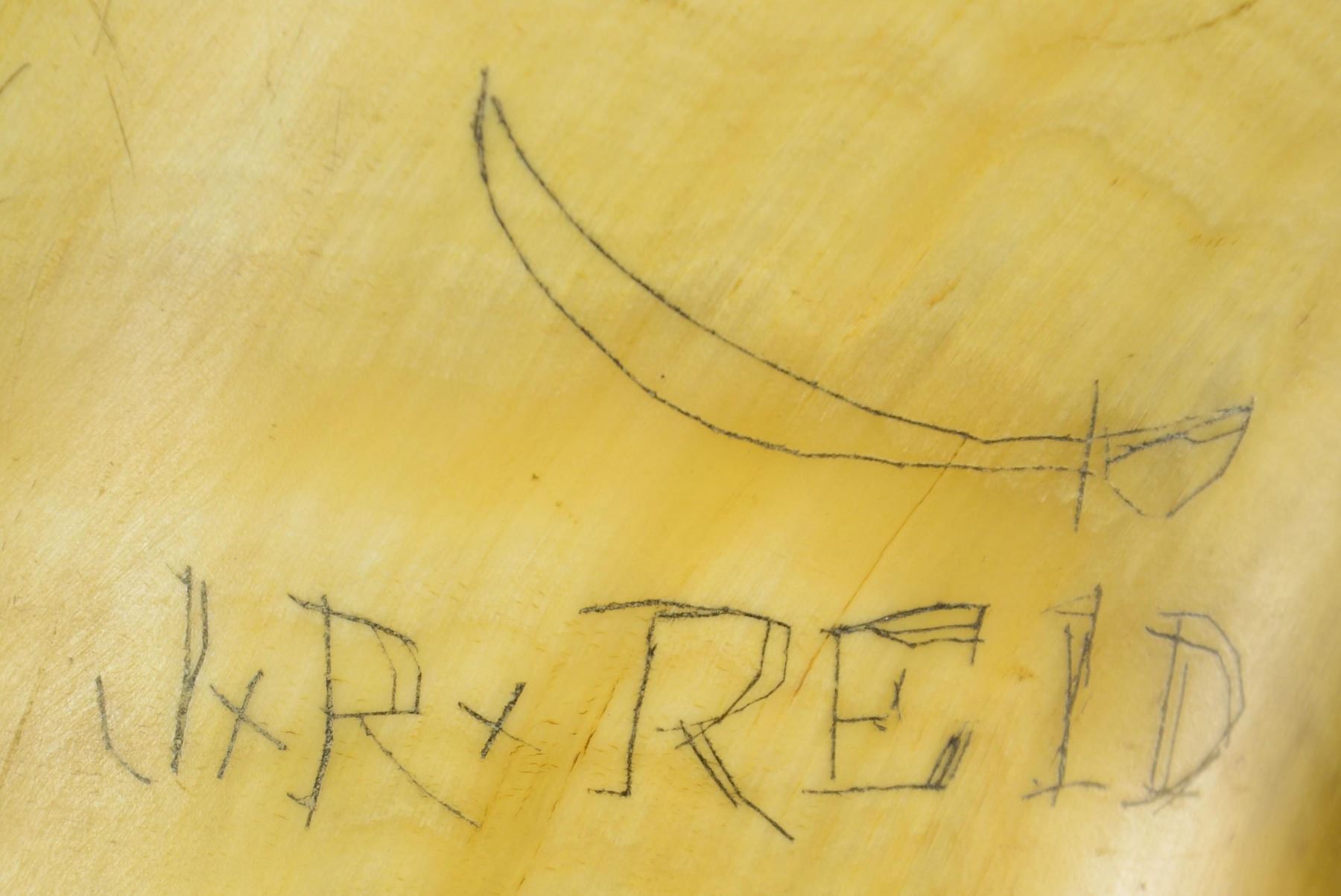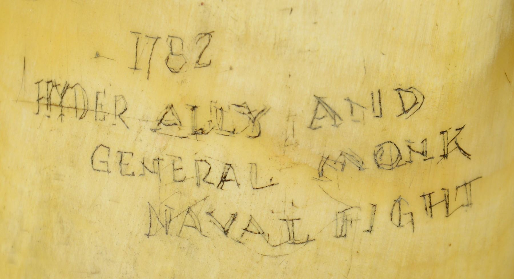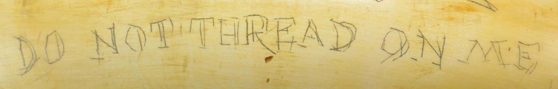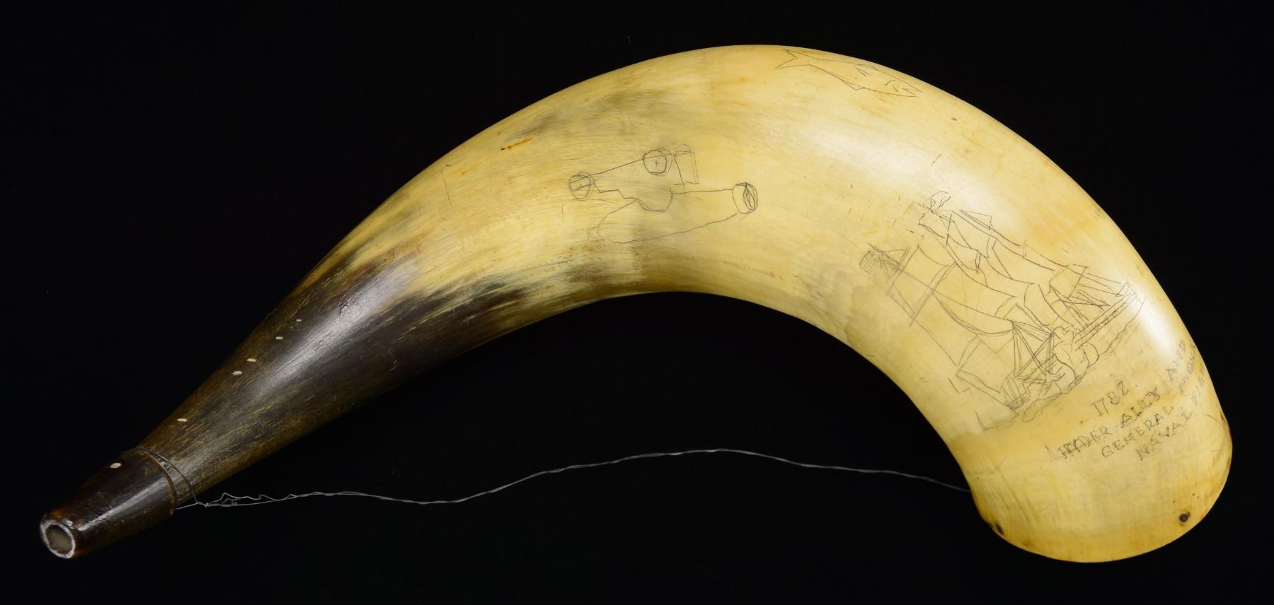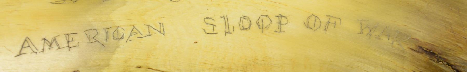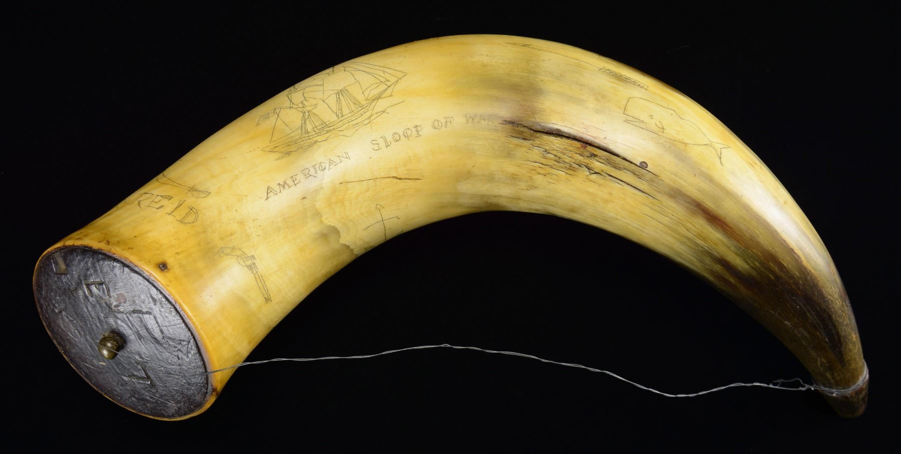 16" overall, old horn with carved wood plug, and more recent scrimshaw designs including sailing ships, "AMERICAN SLOOP OF WAR", "1782 HYDER ALLY AND GENERAL MONK NAVAL FIGHT", "J.R. REID", cannon, saber. whale, and a harpoon. CONDITION: very good overall. (02-23103/JS). NON-GUN. $100-200.
