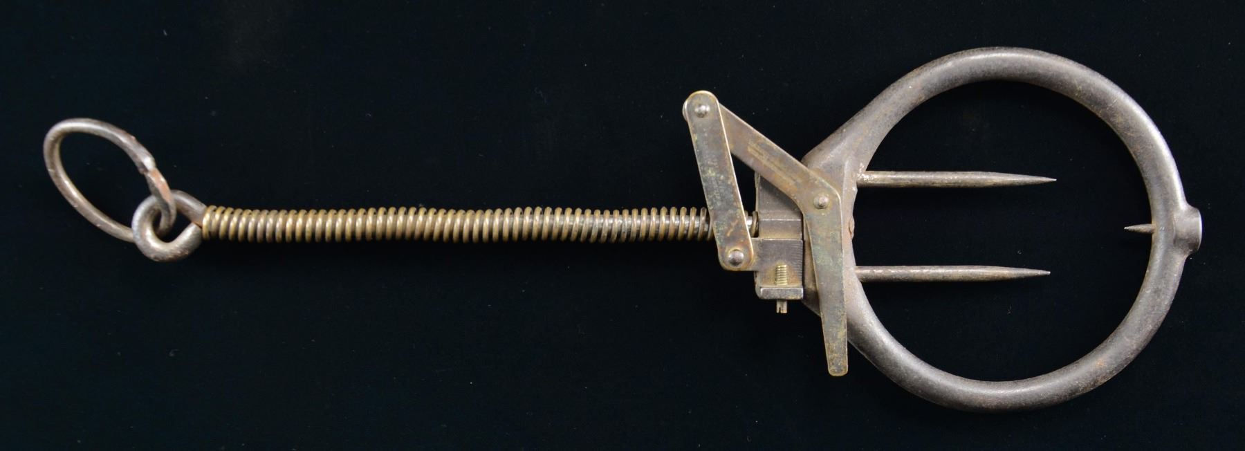 A seldom-seen Dresser & Jillson trap for a mink or a muskrat. The inside ring diameter is 4" and the outside diameter is 5". The iron trap is clearly marked "C. JILLSON’S PATENT. JAN. 6, 1857" and "DRESSER & JILLSON. WORCESTER. MASS." The device is quite genius in its simplicity. The unfortunate animal crawling through the ring releases the spring, plunging to sharpened iron stakes through the doomed creature. UNATTACHED ACCESSORIES: three photocopied pages giving a brief description and value for Jillson traps. CONDITION: this example seems fully functional, with an overall dark patina but no active oxidation. (02-23281/BF). $800-1,200.