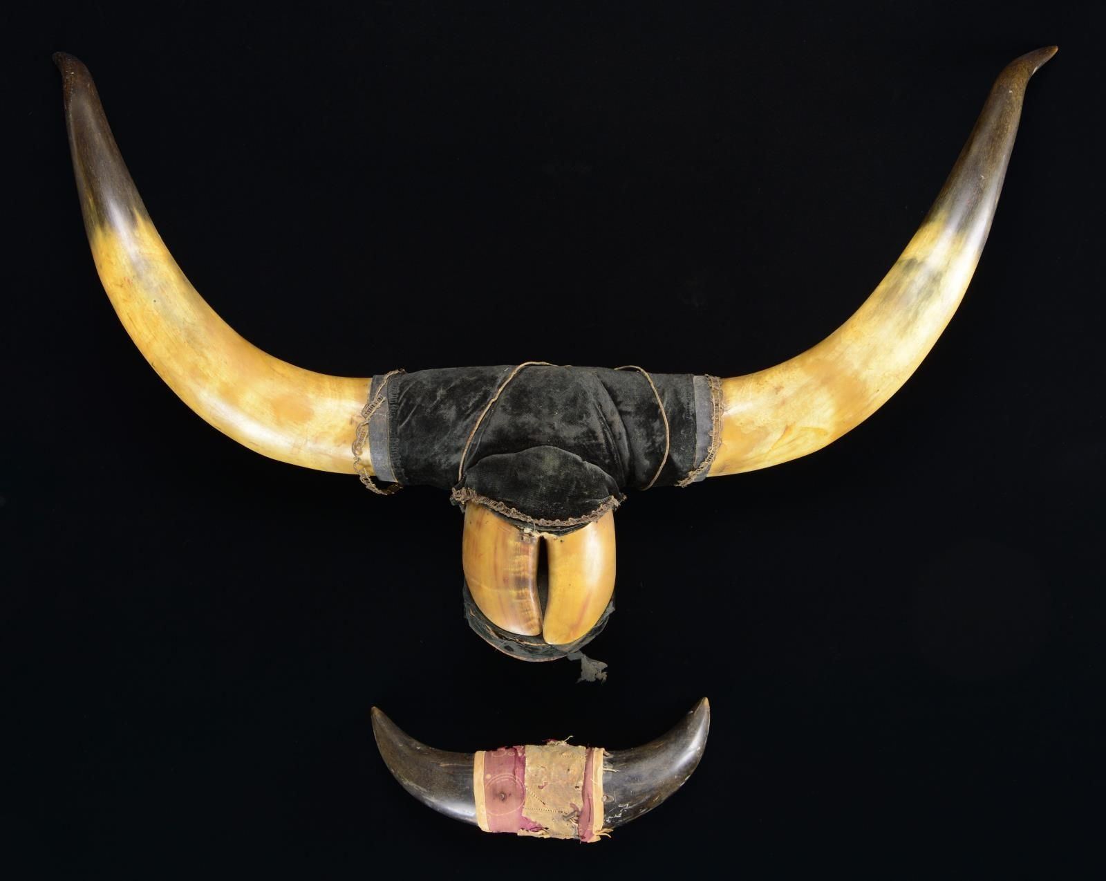 A large pair of bull horns, mounted with a hoof, measures 30" across, with each horn measuring over 20" in length. Also included is a small pair of mounted bison horns, measuring 10" across, with a cloth and velvet-covered mount. Perfect for that bar room, where they may have initially been displayed. CONDITION: good to very good overall condition. PROVENANCE: Martin Lane Historic & Western Americana Lifetime Collection. (02-21636/JS). $200-400.