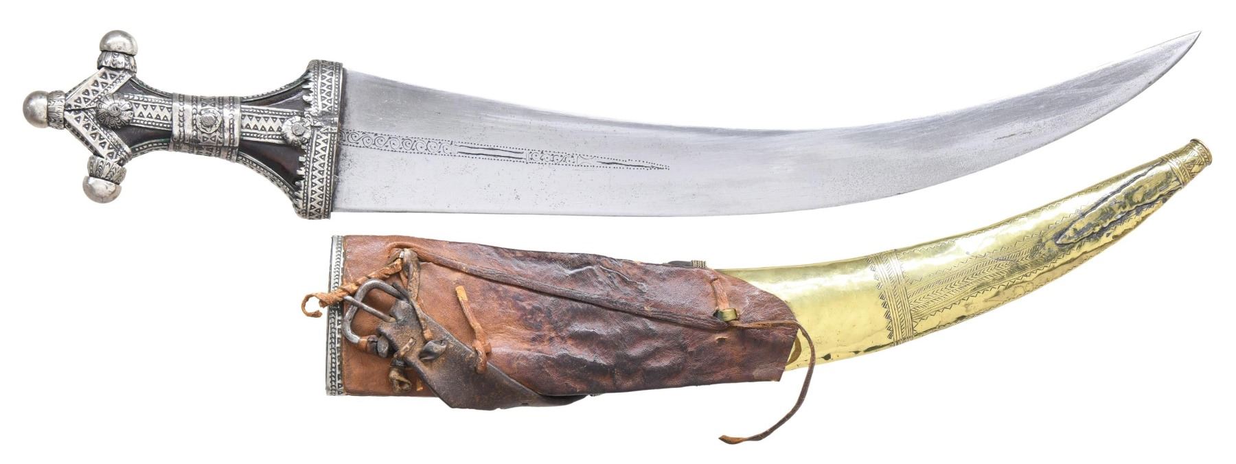 ARABIAN JAMBIYA DAGGER. 22" overall, 17" blade with arabesque scroll design. Brass and silver wrapped wood sheath has engraved geometric design, horn or wood handle is almost completely covered with silver mounts engraved en suite to silver wrapped sheath. CONDITION: very good overall, leather over the shoulder strap is broken off, iron roller buckle is still attached to short portion of strap. PROVENANCE: from the Collection of a Tennessee Gentleman. (02-23048/JS). NON-GUN. $150-250.