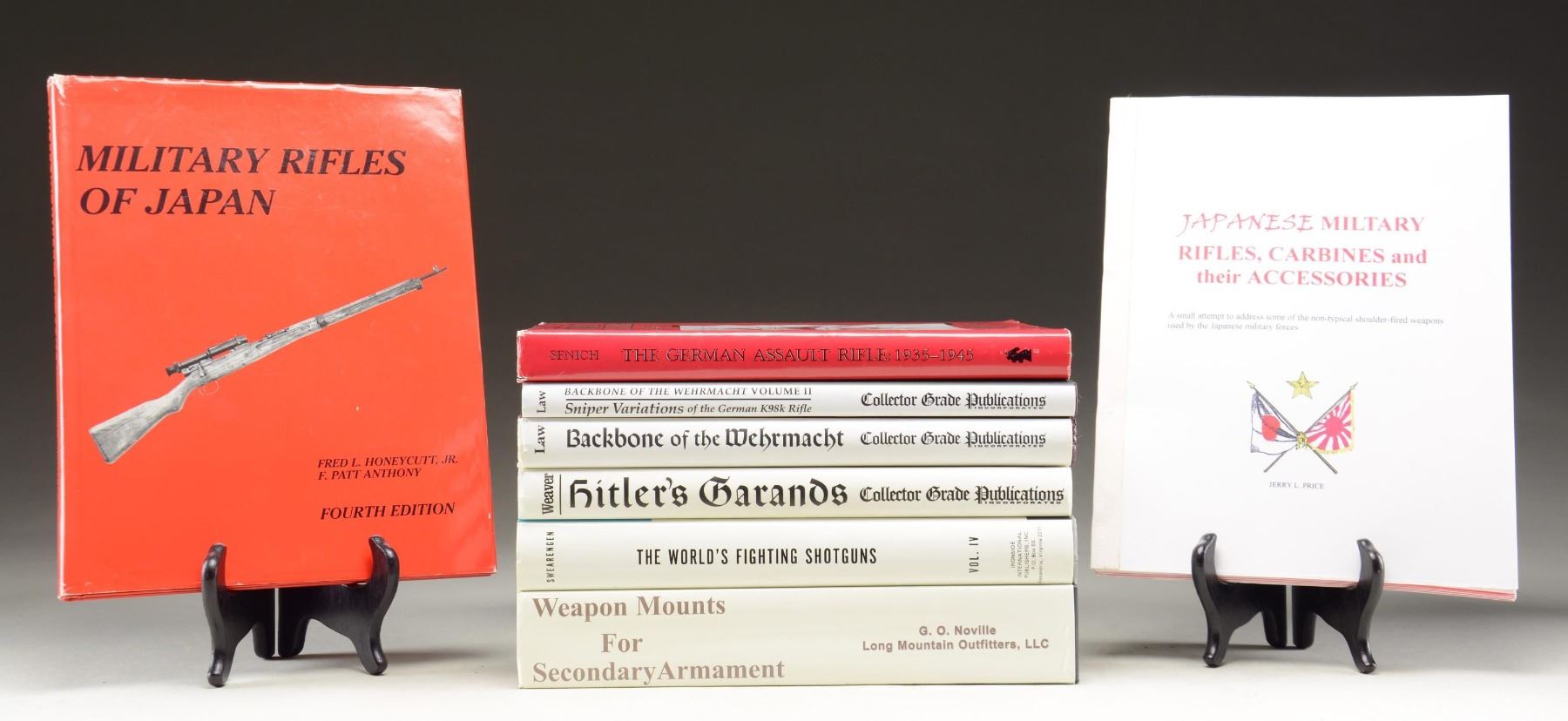 Lot of assorted firearms reference books, including: 1) The German Assault Rifle: 1935-1945, by Peter R. Senich. 2) Hitler's Garands: German Self-Loading Rifles of World War II, by W. Darrin Weaver. 3) Backbone of the Wehrmacht: The German K98k Rifle, 1934-1945, by Richard D. Law. 4) Backbone of the Wehrmacht Vol. II, Sniper Variations of the German K98k Rifle, by Richard D. Law. 5) Japanese Military Rifles, Carbines and their Accessories, by Jerry L. Price. 6) Military Rifles of Japan, 4th Edition, by Fred L. Honeycutt, Jr. & F. Patt Anthony. 7) The World's Fighting Shotguns, by Thomas F. Swearengen. 8) Weapon Mounts for Secondary Armament. CONDITION: good to very good with books and dust covers exhibiting some light wear from handling and storage. PROVENANCE: From the Collection of Mark Ivey Godfrey. (02-23187-5/MLW). $350-550.