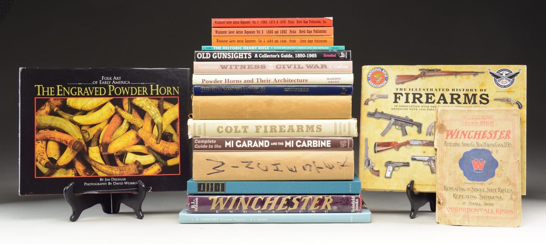 REFERENCE BOOKS. Lot of assorted firearms & firearms related reference books, including: 1) The Winchester Book (1 of 1,000), by Madis. 2) Winchester Dates of Manufacture 1849-1984 (1 of 1,000). 3) Winchester Lever Action Repeating Arms Vol I, Vol II & Vol III, by Arthur Pirkle. 4) The Historic Henry Rifle, by Wiley Sword. 5) The Winchester Model 94: The First 100 Years, by Robert C. Renneberg. 6) Winchester Engraving, by R.L. Wilson. 7) Winchester Catalogue No. 76, June 1910. 8) L.D. Nimschke Firearms Engraver, by R.L. Wilson. 9) The Powder Flask Book, by Ray Riling. 10) Folk Art of Early America: The Engraved Powder Horn, by Jim Dressler. 11) Drums A'beating Trumpets Sounding Artistically Carved Powder Horns in the Provincial Manner 1746-1781, by William H. Guthman. 12) Powder Horns and Their Architecture, by Madison Grant. 13) Colt Firearms from 1836, by James. E. Serven. 14) Old Gunsights: A Collector's Guide 1850-1965, Nick Stroebel. 15) Complete Guide to the M1 Garand and the M1 Carbine, by Bruce N. Canfield. 16) Witness to the Civil War: First-Hand Accounts from Frank Leslie's Illustrated Newspaper, Smithsonian. 17) NRA The Illustrated History of Firearms, by Jim Supica, Doug Wicklund, and Philip Schreier. CONDITION: Books are all very good, with some exhibiting some wear and/or some tearing to their dust covers. Winchester catalog exhibits wear, some holes, as well as age related discoloration. (02-23300/MLW). $300-500.
