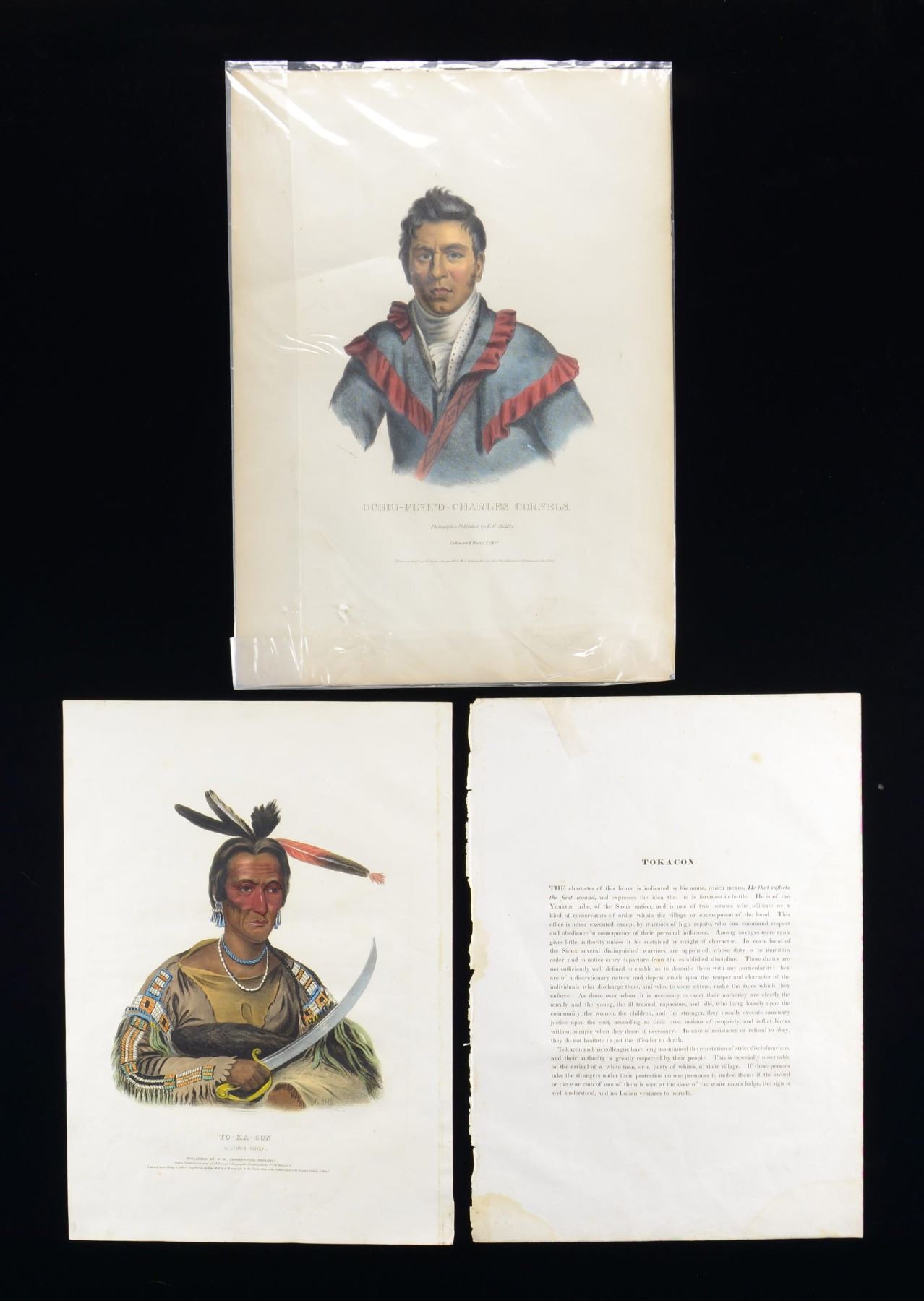 AMERICANS. 1) TO-KA-CON. A hand-colored waist-up view of a Sioux chief named To-Ka-Con. He wears a beaded shirt with two necklaces, earrings, three head feathers, and holds a sword. The print measures approx. 19 1/2" x 14" overall. Under the title are the words "PUBLISHED BY F.W. GREENOUGH, PHILADA Drawn Printed & Colored at I.T. Bowen’s Lithographic Establishment No. 94 Walnut St Entered according to act of Congress in the year 1836 by F.W. Greenough in the Clerk’s Office of the District Court of the Eastern District of Penna." CONDITION: print has one rough edge where it was likely removed from a book. Colors are quite striking. 2) OCHIO-FINICO. A hand-colored waist-up view of a Native American named Ochio-Finico-Charles Cornels. He wears a red-trimmed, gray/blue hunting jacket over a white shirt with red polka dots. Below the image reads "Philadelphia Published by E.C. Biddle. Lehman & Duval Lithr. Entered according to act of Congress in the year 1834 by E.C. Biddle in the Clerk’s office of the District Court of the Eastern District of Penna." Print measures approx. 15 1/2" x 22". CONDITION: print shows very slight foxing but colors remain crisp and vibrant. (02-23201/BF). $300-500.
