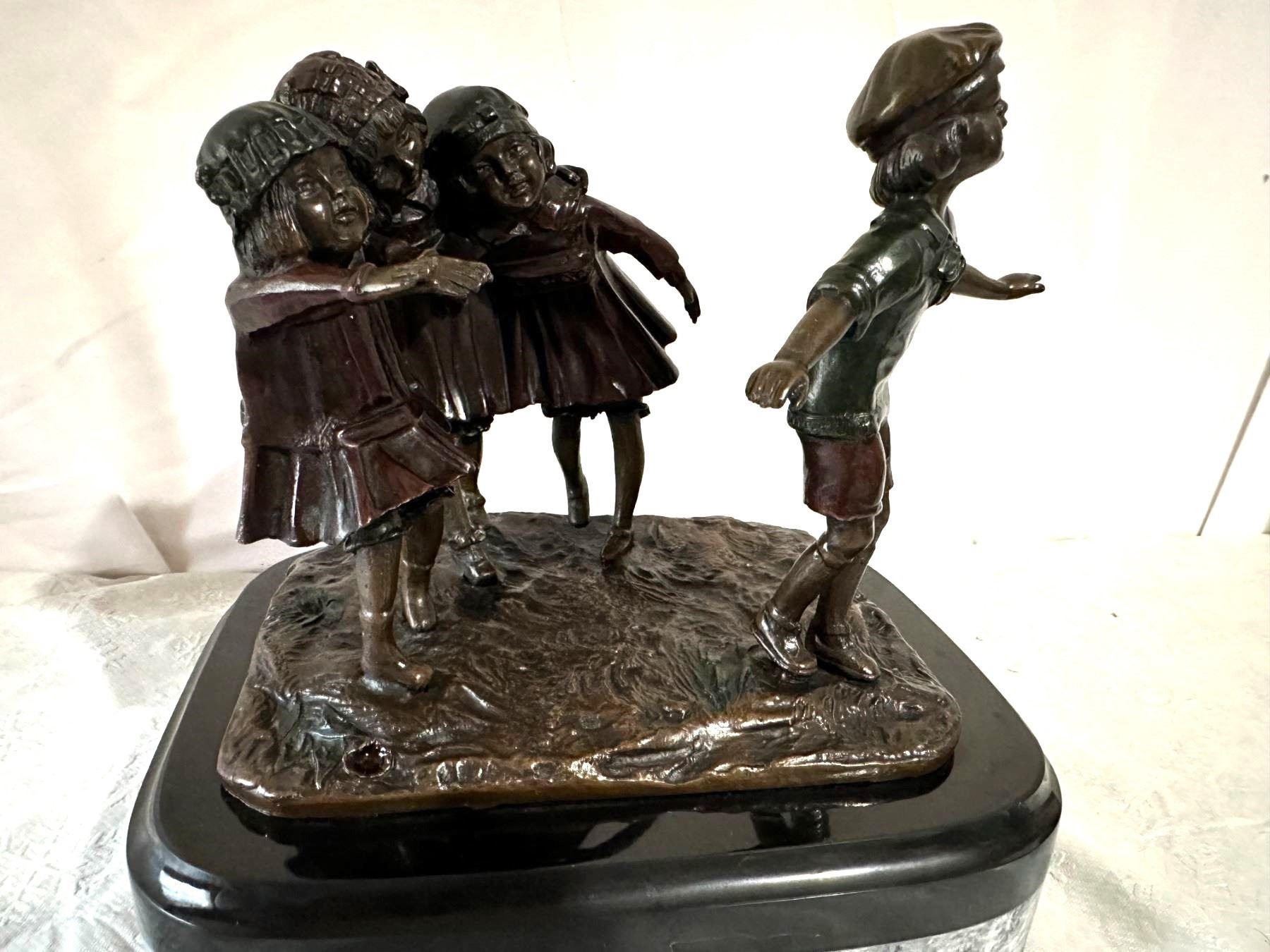 “Hide & Seek” - Beautiful signed/numbered (#27) hand painted bronze by late French sculptor, Demetre Chiparus. With a stunning patina, this lovely piece features four children at play. Bronze measures 9.75"Wx7.75"Dx9.75"H and weighs nearly 30lbs. Demetre Chiparus is best known for his Art Deco sculptures, often bright and evocative featuring dancers, children and animals. His depiction of children in his sculptures is world-renowned, making this bronze a great addition to any collection. DALLAS SAFARI CLUB THANKS RUSSELL & MARY EDITH STACY FOR THIS 100% DONATION. Russell and Mary Edith Stacy, maryedithstacy@icloud.com.
