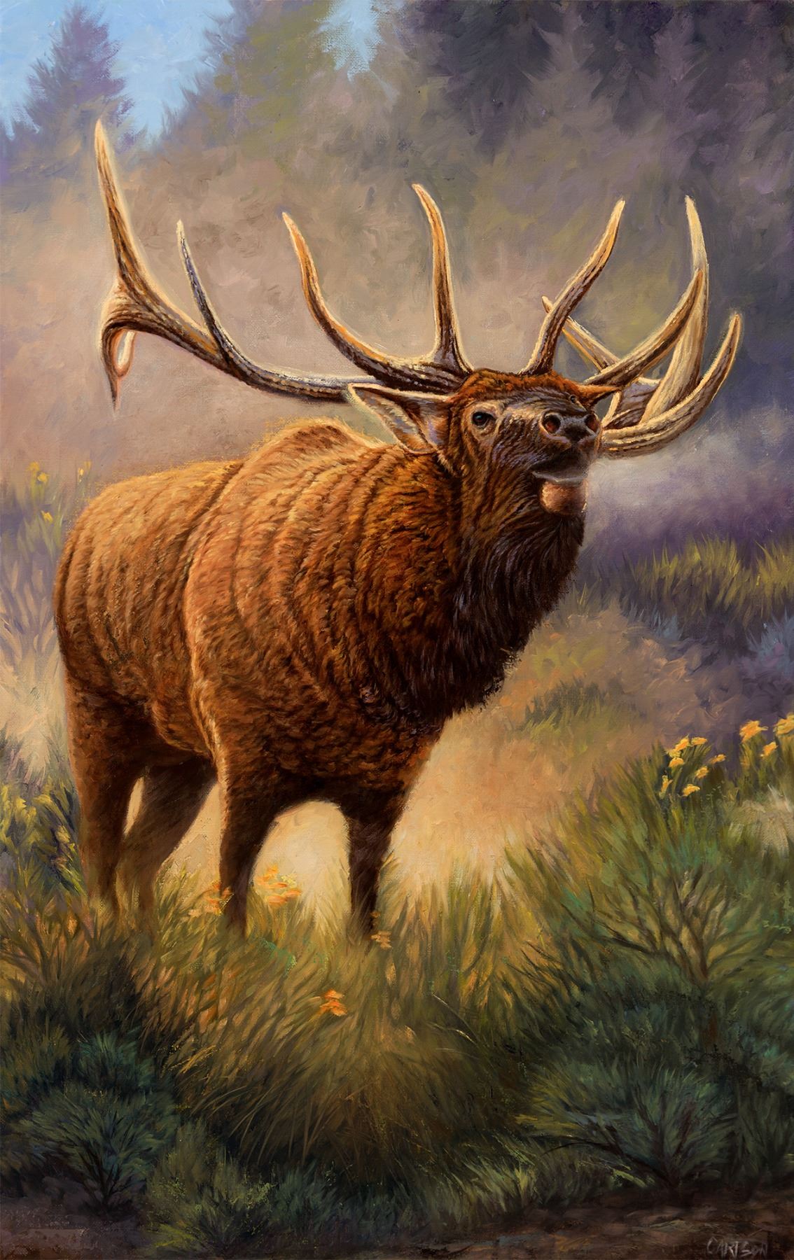 "Autumn Challenge" - Original oil painting on Belgian linen by Cory Carlson, measures 30"x22" framed. "By traveling the world, capturing rare moments in wild places, I strive to infuse a sense of life into every painting, bringing you closer to nature’s extraordinary beauty. Observing a magnificent bull elk moving through the rising mists of dawn is the inspiration for "Autumn Challenge." The majestic sound of a bugling elk heralds the start of a perfect day in the Rocky Mountain wilderness. Imagine the thrill of waking up to the echoing calls and the cool edge of autumn on the mountain air. I enjoy the challenge of painting this ethereal time of day when the earth and sky seem to blend in the soft misty light. I like the contrast of the boisterous bull elk emerging from the still early morning light." - Cory Carlson. Cory Carlson, 817-492-0915, 318-243-1014, 376 Shadow Rd., Ruston, LA 71270, carlsonfineart@gmail.com, CarlsonFineArtStudio.Com, BOOTH #3459.