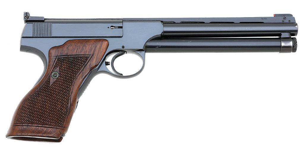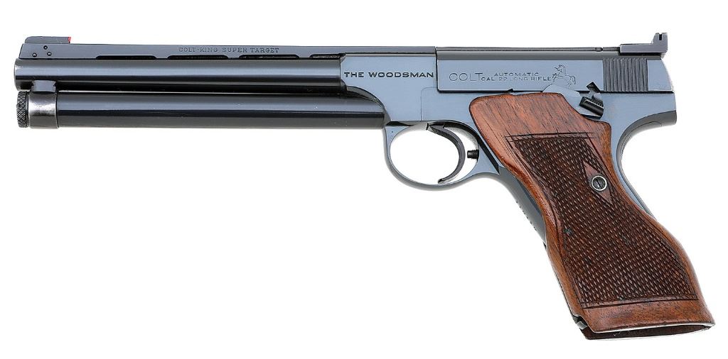 serial #119119, 22 LR, 6 5/8" round barrel with a bright excellent bore. This pistol is equipped with a King reflector front sight mounted on their full vented rib with adjustable barrel weight mounted beneath the barrel. The pistol retains about 99% original bright blue overall with just a tiny amount of muzzle wear. In addition to the rib and weights the gun wears a wonderful set of extended target grips which are diamond checkered and retain about 95% of their original finish. The grips have a wonderful feel and the pistol is a dream to point. This is likely the finest and most handsome King Converted Colt Woodsman we have ever handled. An absolutely top shelf pistol for the Woodsman or American target pistol collector. (1B11759-36) {C&R} (4000/6000)