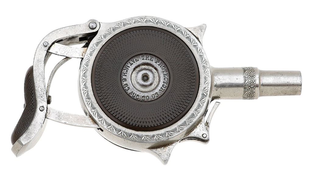 serial #7774, 32 RF Extra Short, 1 3/4'' barrel with a bright excellent bore. The metal surfaces retain about 94-95% original nickel finish showing a bit of light flaking along one side of the barrel and cover knurling, and some sparsely scattered fine oxidation speckling. The maker and patent dates are crisp and the arm shows the expected light floral embellishments. The black checkered hard rubber cover plates and backstrap remain in near excellent condition, the serialized parts are matching, the grip safety is intact and the action seems to function well mechanically. A very fine example of these interesting palm pistols for the antique arms collector. (13B11705-6) {ANTIQUE} (1800/2200)