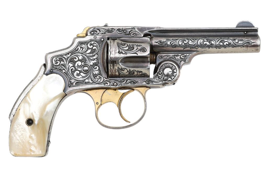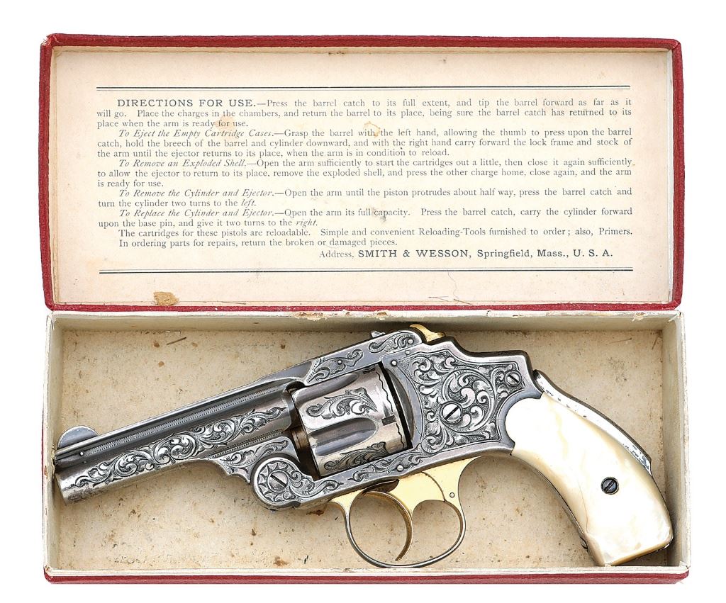serial #64300, 38 S&W, 3 1/4'' barrel with a bright very fine bore showing a few small areas of light oxidation and strong rifling. This fancy revolver features lovely detailed flowing foliate scrollwork throughout with fine punch-dot background shading, shell-like patterns on hinge and zigzags along the sides of barrel. The metal surfaces retain about 90% period silver finish showing some scattered light handling marks and some areas of light flaking along the gripstraps and high edges which are taking on a lighter patina blending in very nicely with the surrounding medium gray tarnished silver. The trigger, triggerguard and latch are gold-washed, the bow of the guard thinning somewhat to gray, and all of the embellishments and barrel markings remain crisp. The revolver wears a set of period smooth mother-of-pearl grips that remain in near excellent condition showing a few tiny handling marks and taking on a slight yellowish tinge. The inside surfaces of the grip panels are lightly scratched ''HV'', the remaining numbered parts are matching and barrel-to-frame fit is solid. The revolver includes an original red pebbled paper-covered box in very fine to near excellent condition showing some mild discoloration and edge wear along the exterior. The orange end label is completely intact calling out nickel finish and the bottom appears to be pencil-numbered ''1946''. The box contains an old bore brush and the lid label is intact. A beautiful 38 Safety Hammerless revolver. (13C11199-86) {ANTIQUE} (2500/3500)